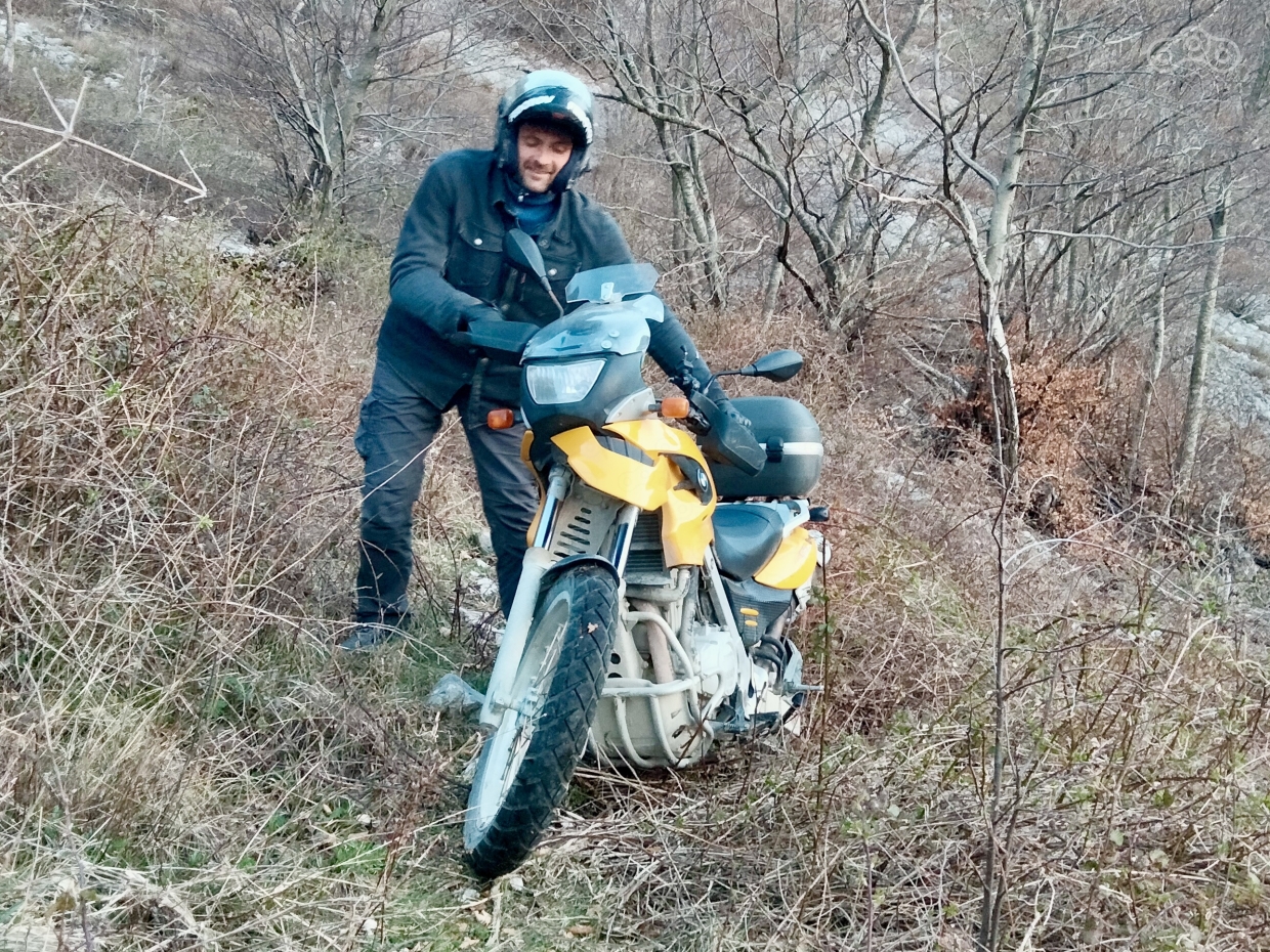 Старая заброшенная дорога, местами заваленная камнями, местами обвалившаяся. Доехали до середины, решили вернуться ещё, но на чем-то полегче.