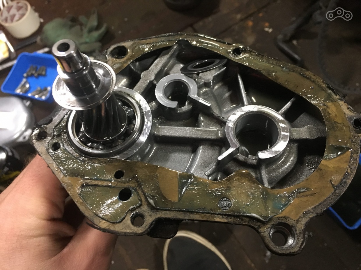 А вот новый сальник потек, причина - в уставшем подшипнике первичного вала. Его я приговорил сразу, отправившись в глубь трансмиссии.