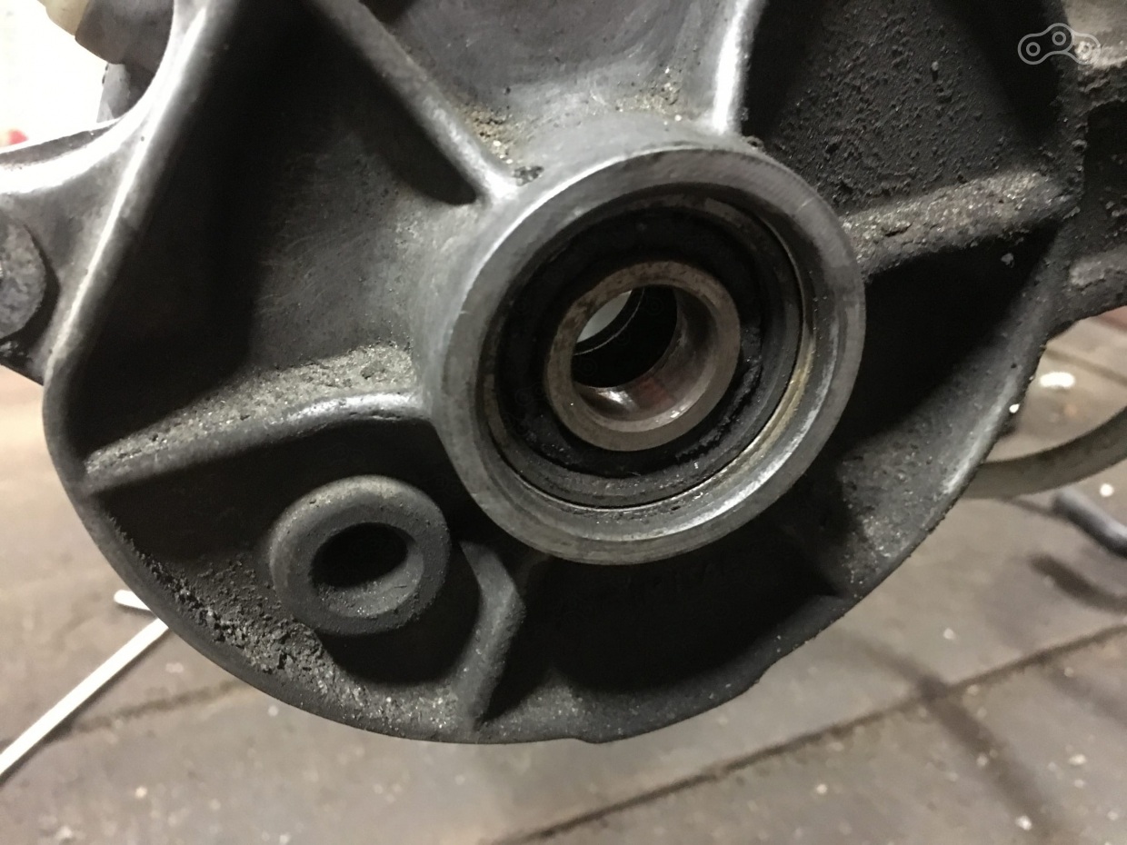 От него не осталось вообще ничего, пластиковые пыльники превратились в мусор, смазка давно высохла. Люфт на оси - страшный, но, что интересно - во время замены ступицы его не было вообще. Понятно, что помимо подшипника вал скользит по втулке в крышке редуктора, поэтому люфт не так ощущается, но мертвый подшипник я бы увидел. Чудеса!