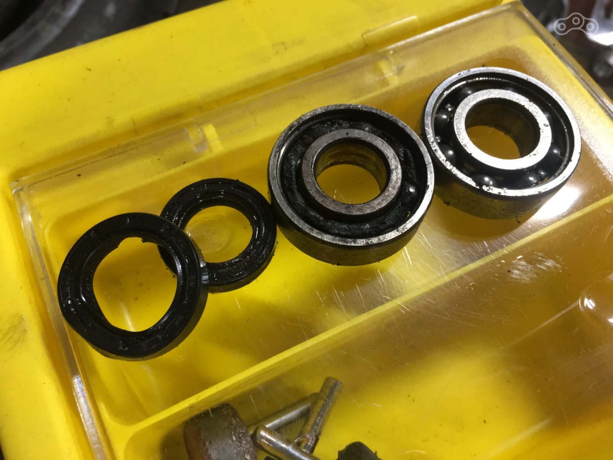А вот подшипники, впрессованные в корпус редуктора наиживейшие. Без люфтов и шума, их я трогать не буду. Путешествие в мусорную корзину ждет два других, а с ними и пару сальников.
