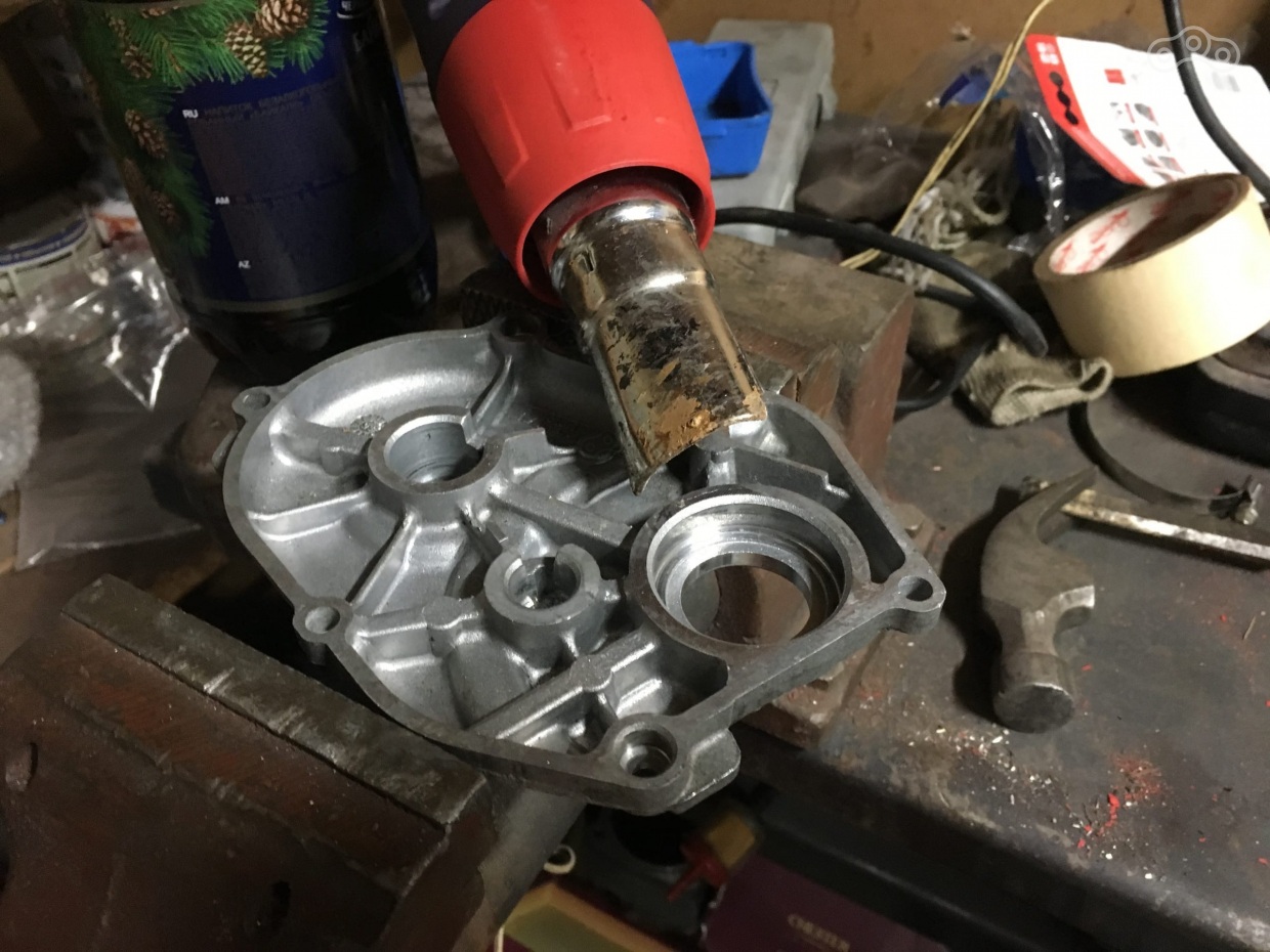 Отдельная история - запрессовка подшипника в крышку. Лет десять назад я бы ее просто забил молотком и дело в край, но теперь я старый, наученный, все по фен-шую делаю. Фен - строительный, нагревает посадочное место, которое немножко расширятся. А вместо шуя-охладителя я использовал обычный карб-клинер, которым обильно облил подшипник, загодя напрессованный на вал.