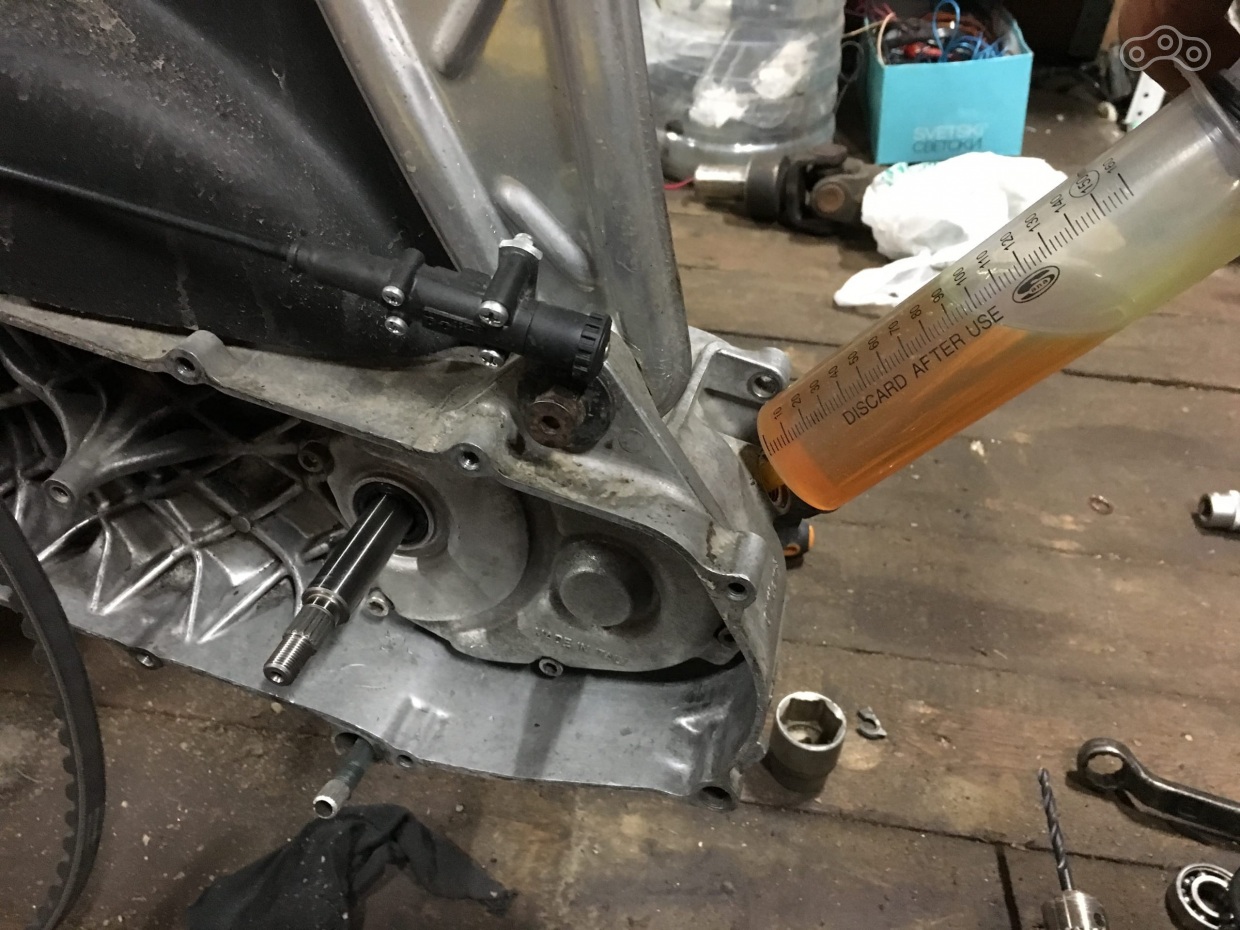 По заводу налил и масла, 110 кубиков. Не поленился, отмерил шприцем, вместо того, чтобы по старинке наливать на глаз из 150-кубового тюбика. Налил, затянул заливную пробку и начал ручками крутить колесо, чтобы шестерни раскидали масло, заполнив подшипники и прочие места, где оно должно быть. Впрочем, в самых важных местах оно было закапано заранее, чтобы исключить работу на сухую после сборки.