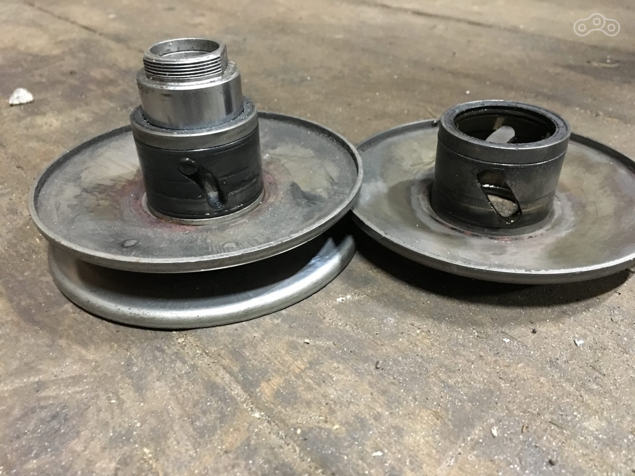 Торк-драйвер это механизм, который позволяет ведомому шкиву сжиматься и разжиматься следом за ведущим шкивом вариатора. Штуковина крайне важная для тонкой настройки трансмиссии, которая в моем случае не требовалась. Для меня было достаточно поиграть с его пружиной, выбрав подходящую жесткость и подобрать пружины колодок центробежного сцепления, опять же нужной жесткости.