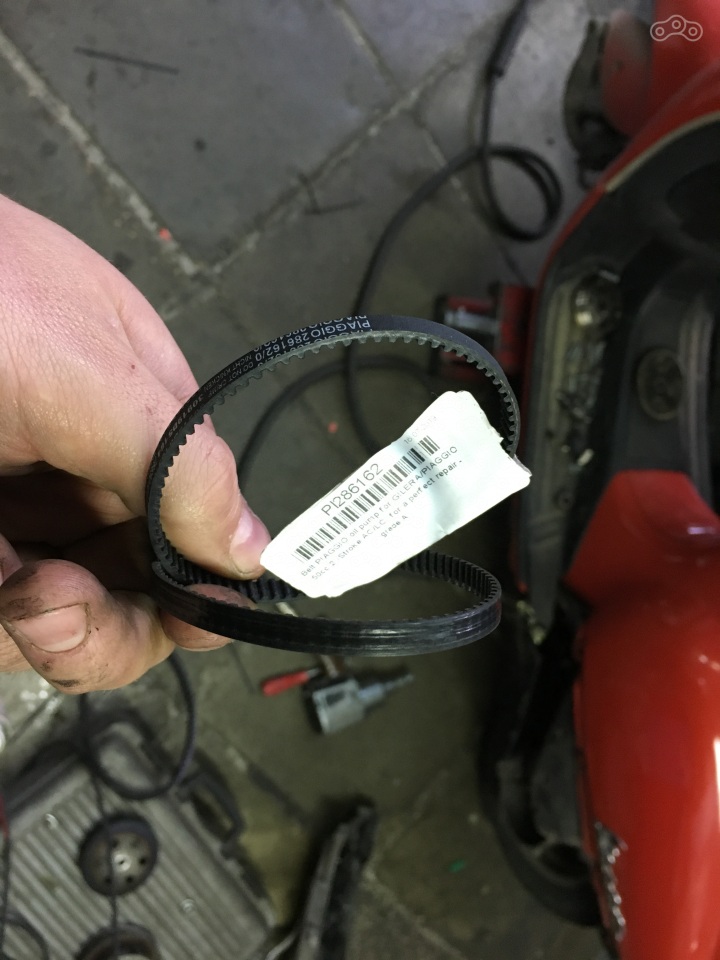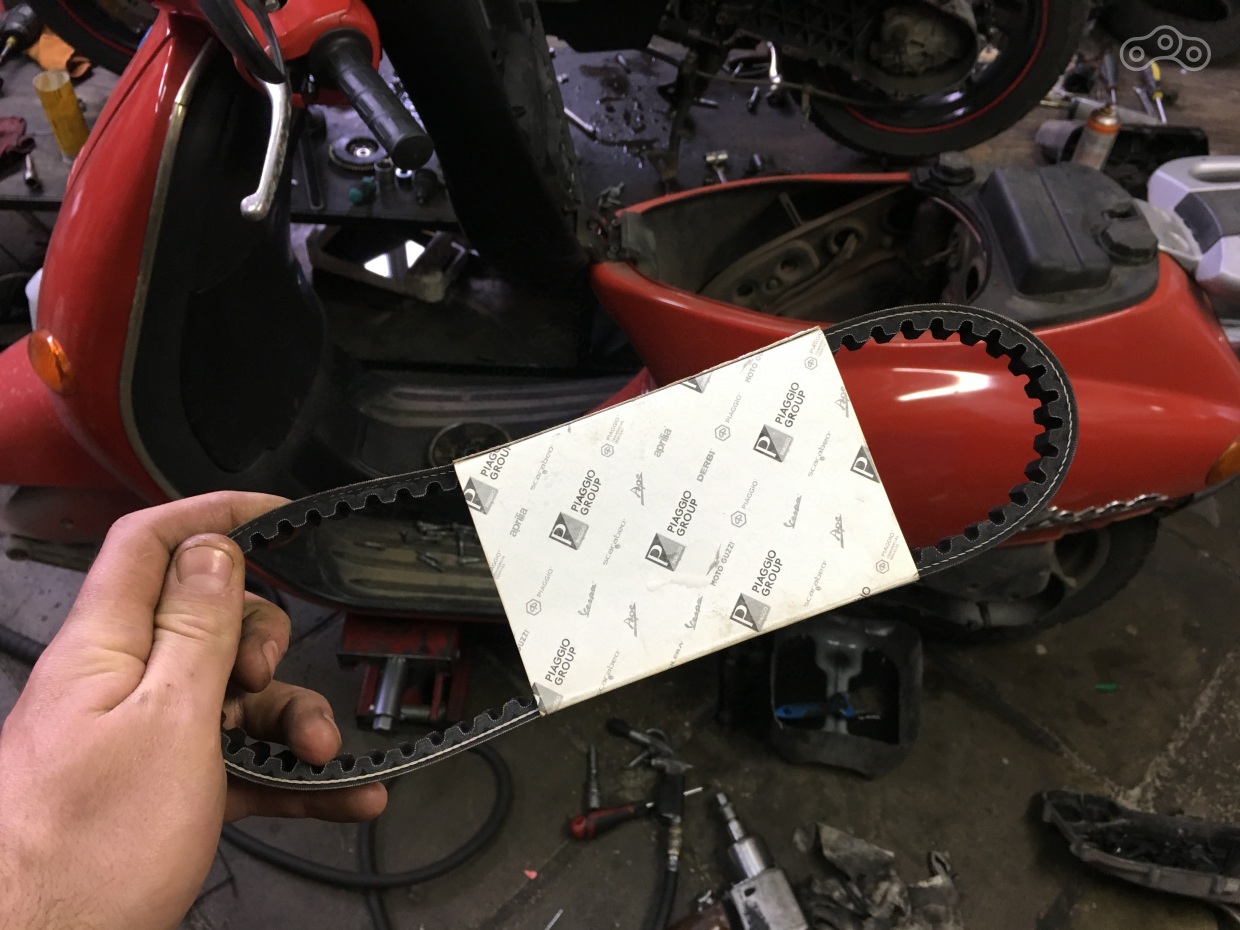 А ещё несколько спонтанно, но осознанно заскочил к официальному дилеру, где поменял переднюю резину и заменил старые оригинальные ремни новыми, не менее оригинальными. Весповский мотор имеет одну особенность - ременный привод маслонасоса.