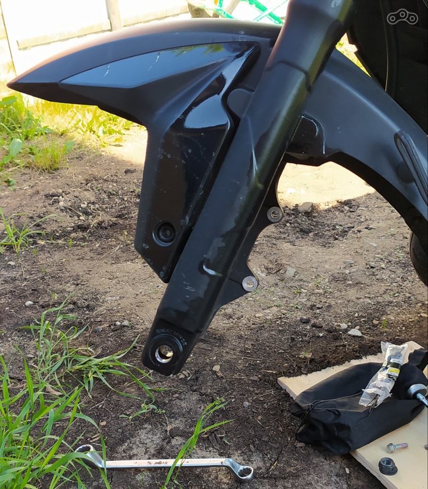Дальше снял колесо. Процесс несложный, описывать не стоит, ключики не помню 17 и 22 вроде. Ослабил нижние болты в перьях (очень забавная процедура, т.к. стакан постоянно стремится крутиться вместе с болтом, я зафиксировал частично вставленной осью переднего колеса).