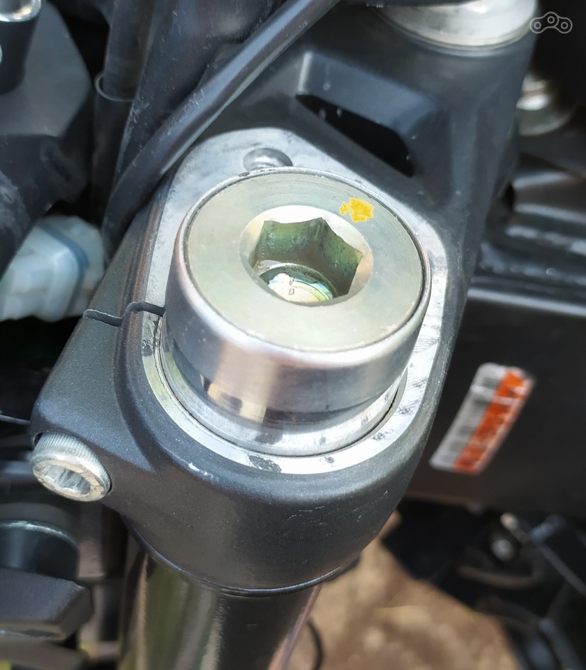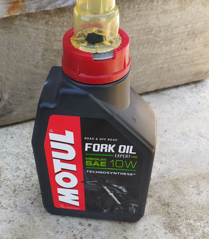 Залил немного масла, прокачал, начал доливать до нужного уровня. В мануале написано, что после полной переборки нужно залить 285 мл. масла, но измерять объем было нечем, так что воспользовался вторым вариантом, указанным в том же мануале: в полностью сжатом состоянии с неустановленной пружиной от верхней части лома до уровня масла должно быть 195 мм. Из подручных средств сделал щуп нужной длины, ну а дальше несколько итераций "добавил-измерил". После наживил и закрутил пробку, насколько это возможно без установки на мотоцикл.