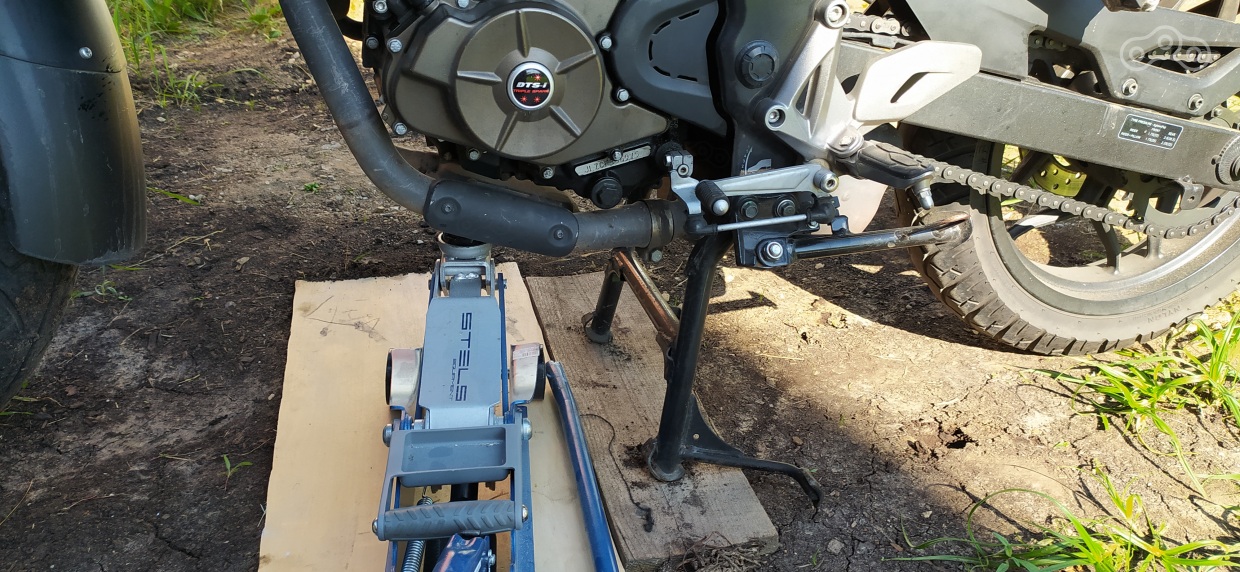 Следующий шаг - разбирать Бабайку. Вышел во двор, поставил мот на центральную подножку, поддомкратил переднюю часть, чтобы вывесить переднее колесо.