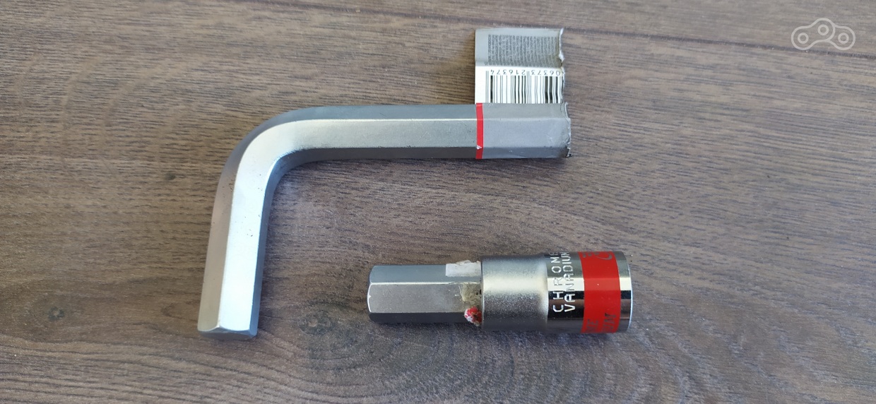 Ужасно не хотелось по жаре тащиться пешком в "автозапчасти" т.к. ближайший магазин автозапчастей находится примерно в полутора километрах от дома. Но выбора нет, поперся жариться. Данный поход тоже описывать не буду, но результатом стало приобретение шестигранника на 14 и такой же головки. Естественно головка на 14 у меня есть, но она лежит в чемоданчике, он в машине, а машина около дома в Москве )) Зато на даче в изобилии хранятся динамометрические трещотки.