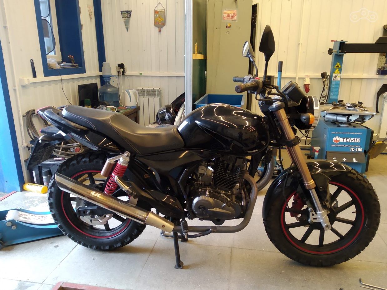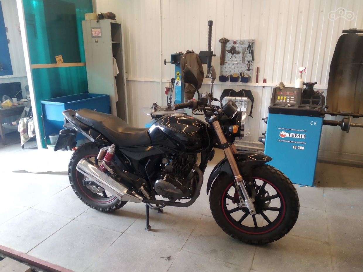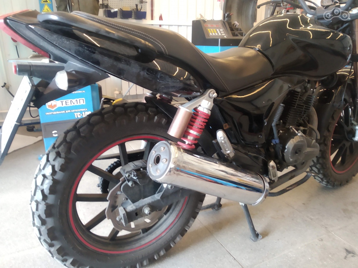 Ну и пока мертвая резина меня не убила заказал комплект Шинко e700 4.60-17 перед и 5.10-17 назад. В нормальном размере это примерно 115/80 спереди и 130/80 сзади. Много расписывать не буду, высота резины больше чем стандартная (родная 70-я), поэтому пришлось поднимать переднее крыло, но по идее надо делать новый кронштейн крыла, так как высоковато задрал и местами на грунте и колдобинах крылом цепляет за нижнюю траверсу. На заднее колесо встало без проблем все.