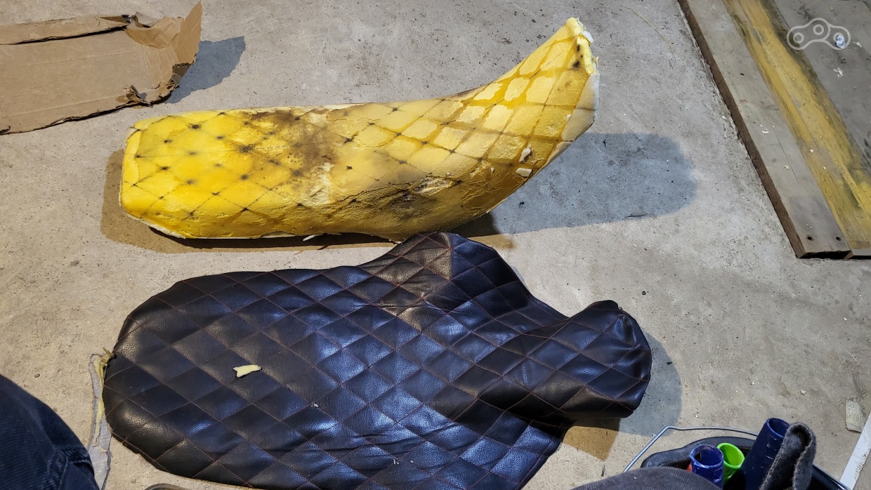 сиденье было обтянуто шкурой како-то циганского осла или крысы, поэтому я выклянчил у подруги крутой ( по её словам )кусок Винилискожи для отделки диванов на катерах да ещё и буйно жёёлтого цвета