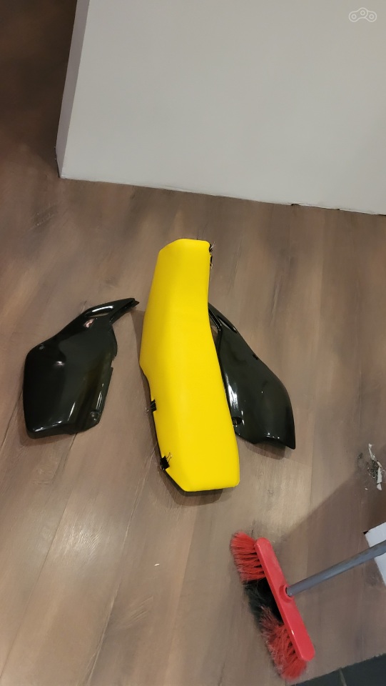 пришлось весь пластик ставить чёрный - ненавижу чёрный ((( но всё упиралось в заднее крыло - хотел именно горбатое олдскульное с большим фонарём . белые выпускались только до 98го года. его и хотел.но их нет в природе уже . было во владике но оказалось продано уже давно. от кавасачьего зелёного у меня судороги - бесячее. - ( и это говорит тот, кто натянул кисллотно жёлтую шкуру на сидуху ) поэтому взял единственное в хор состоянии чёрное ! от него и плясал в итоге . чёрные боковины уже были - в тон пусть и остальное пришлось сделать . итого промежуточный вариант получился пока таков