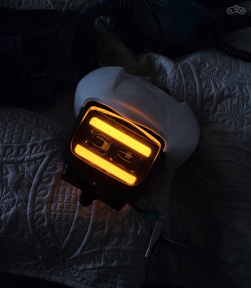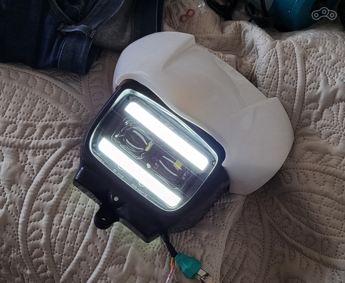 Настала очередьь морды - тк , то что там стояло - улетело в помойку. Морду собирал по частям в оригинал. спасибо авито и алику. - собрав её полностью решил поменять родную фару на диодную .но все диодные даже самые маленькие 6х4 дюйма были немного болше чем оригинал ( это вам не DRZ ) но ничего, решил рискнуть. заказл.. ждал ... фара пришла. почесав репу - взял опять же мой любимый инструмент - болгарку с наждачным кругом и стал убирать с фары всё лишнее . ну там немного пришлось снять снизу по краям. потом с помощью строителного фена подогнал пластик морды под фару, придумал крепление из аллюминия аналогичное родному и собрал.