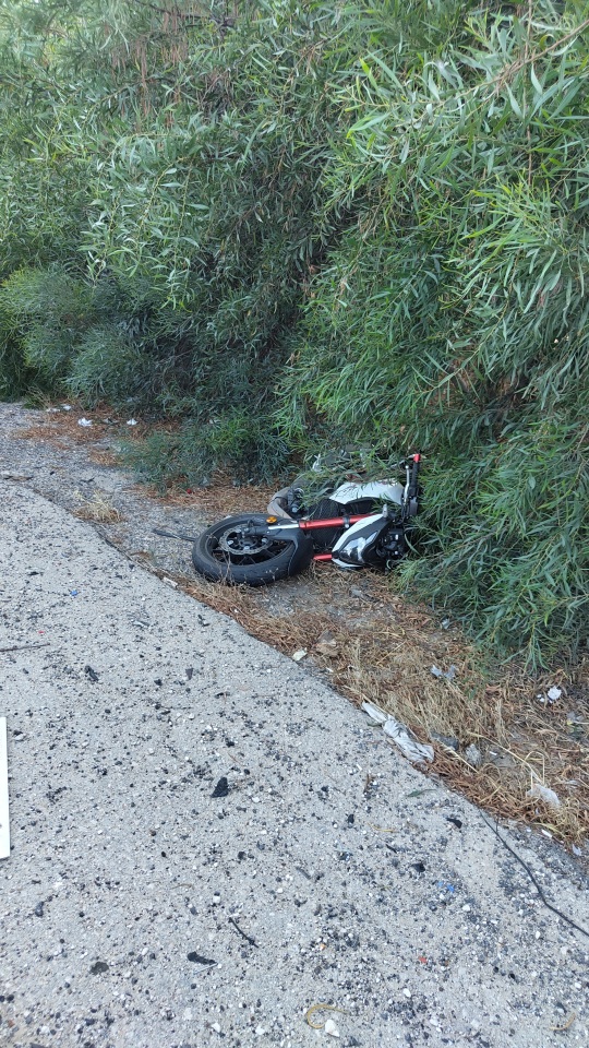 мотоцикл проскользил по асфальту , хорошо проскользил метров 50 и улетел в кусты, мои друзья приехали забрали его и поставили сразу же в гараж. Мотоцикл восстановлению и ремонту не подлежит списывают с дороги...