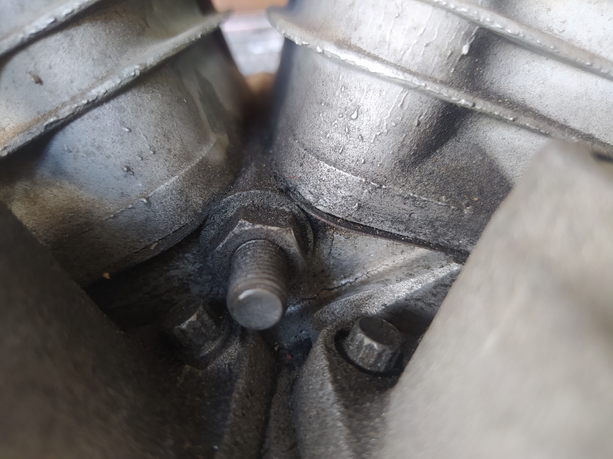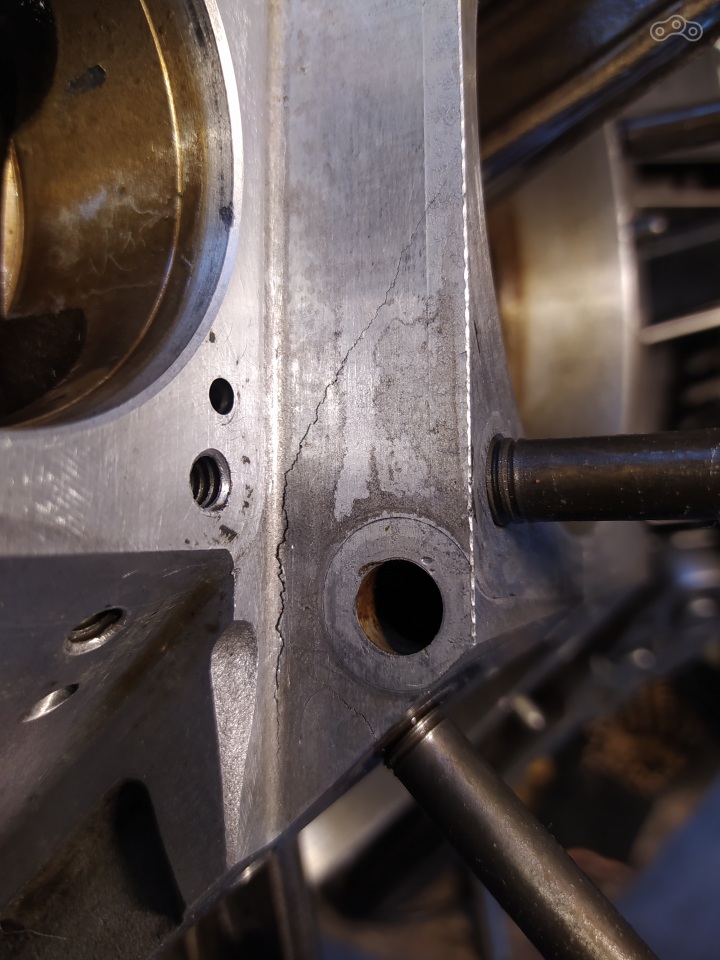 Он уже пришел таким из США. Я заметил горизонтальную трещину, но она никак себя не проявляла, и вот, однажды, я взглянул на мотор после небольшой пробежки и увидел, что он весь в масле. Когда завел, увидел, что из-под переднего цилиндра масло течет, и заметил вертикальную трещину, точнее, параллельную шпильке цилиндра. И я понял, что случился еще один кошмар харлевода: вырвало шпильку. Ничего не поделаешь, надо разбирать.