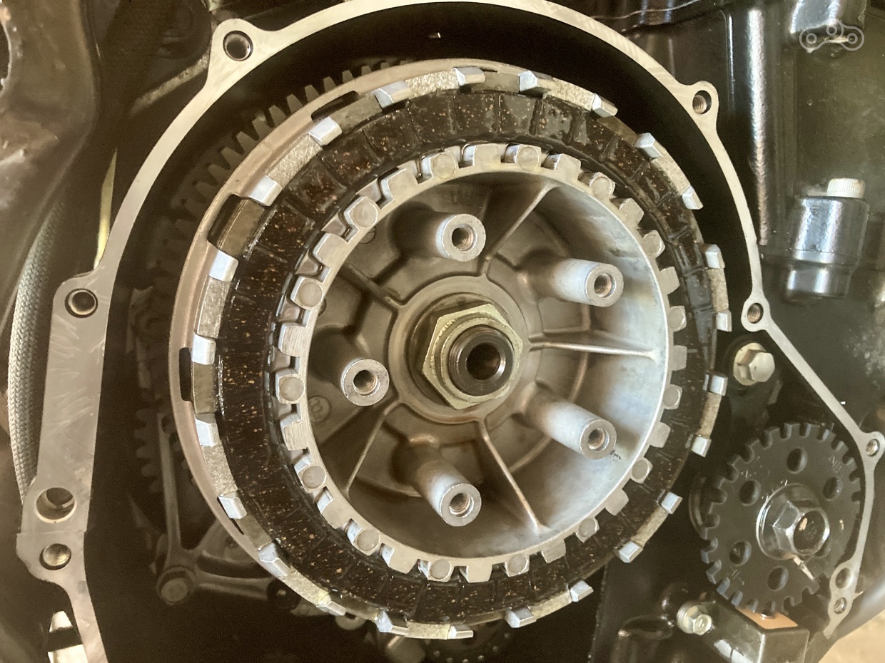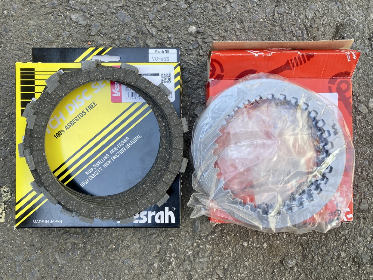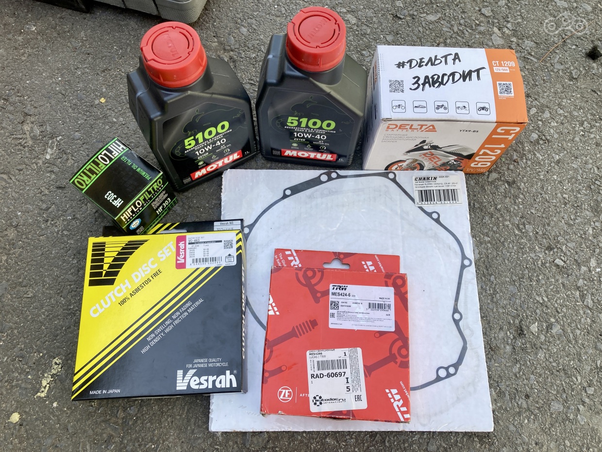 Слил масло, скинул крышку (для этого пришлось снимать дуги) и промерил диски с пружинами. Как и ожидалось, все кроме пружин перешагнуло сервисный лимит. EBC найти не смог, поэтому заказал фрикционы Vesrah, а промежуточные диски TRW. Так же взял ноунеймовскую прокладку и новый тросик сцепления. Тросик турецкий, но по длине и диаметру точь-в-точь оригинальный.
