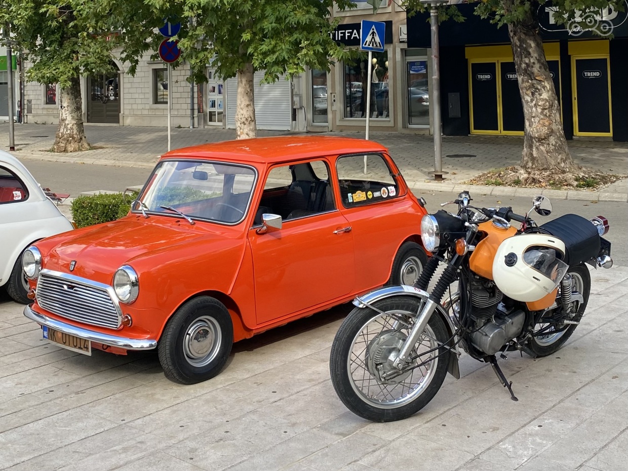 И забавное: оцените соотношение размеров маленького, по сегодняшним меркам, мотоцикла с автомобилем Мини: