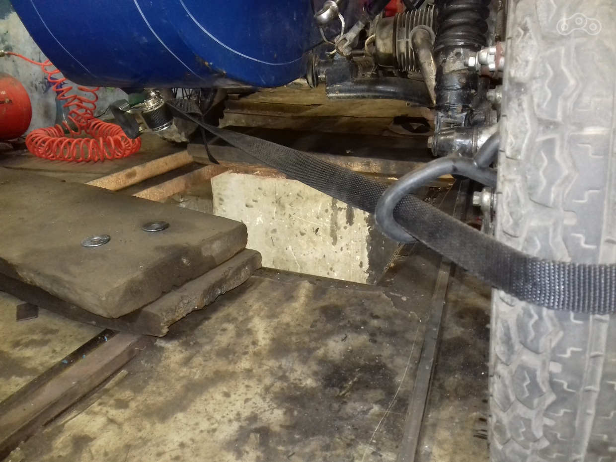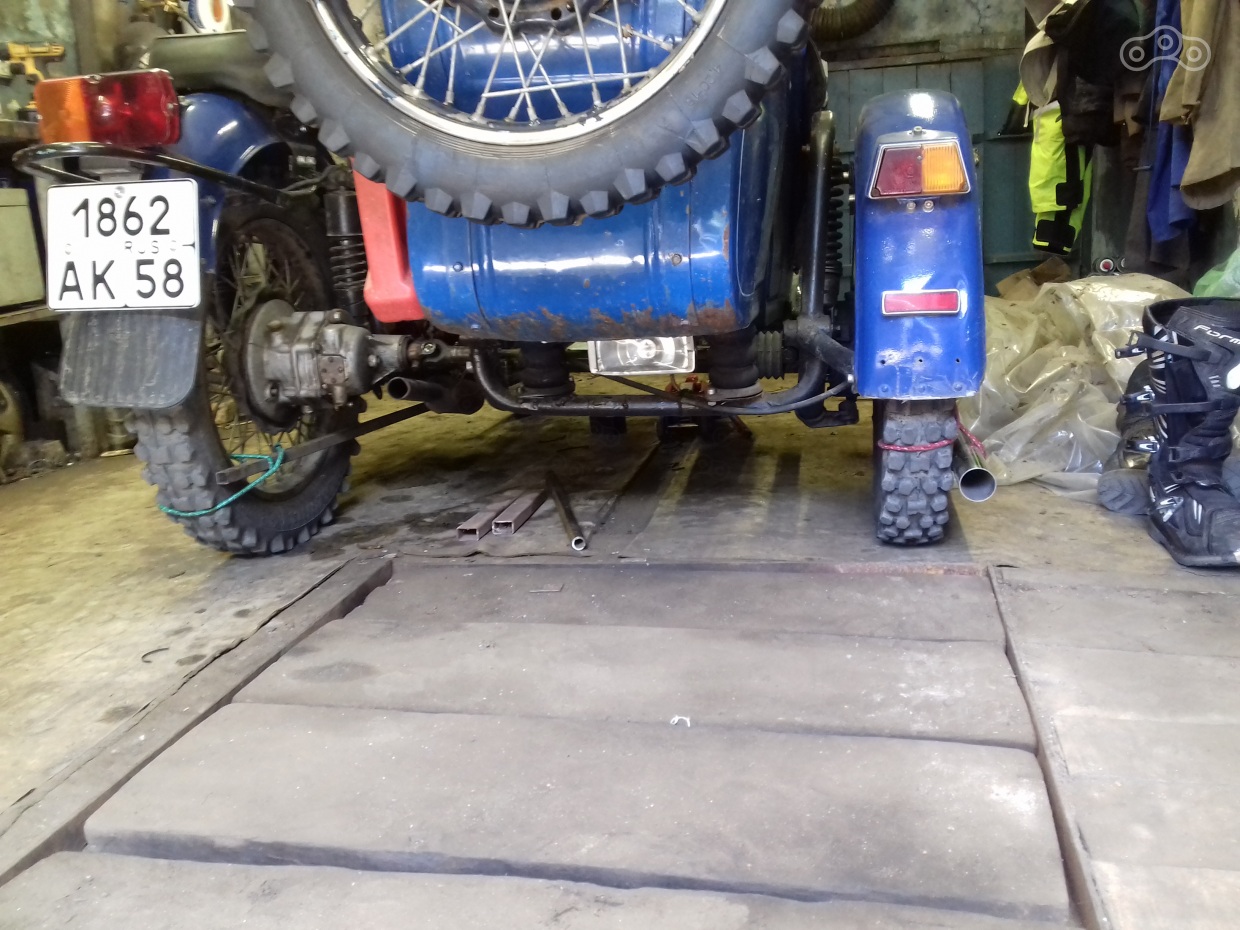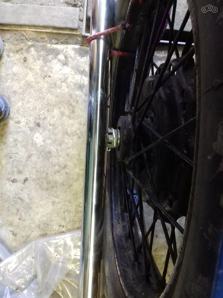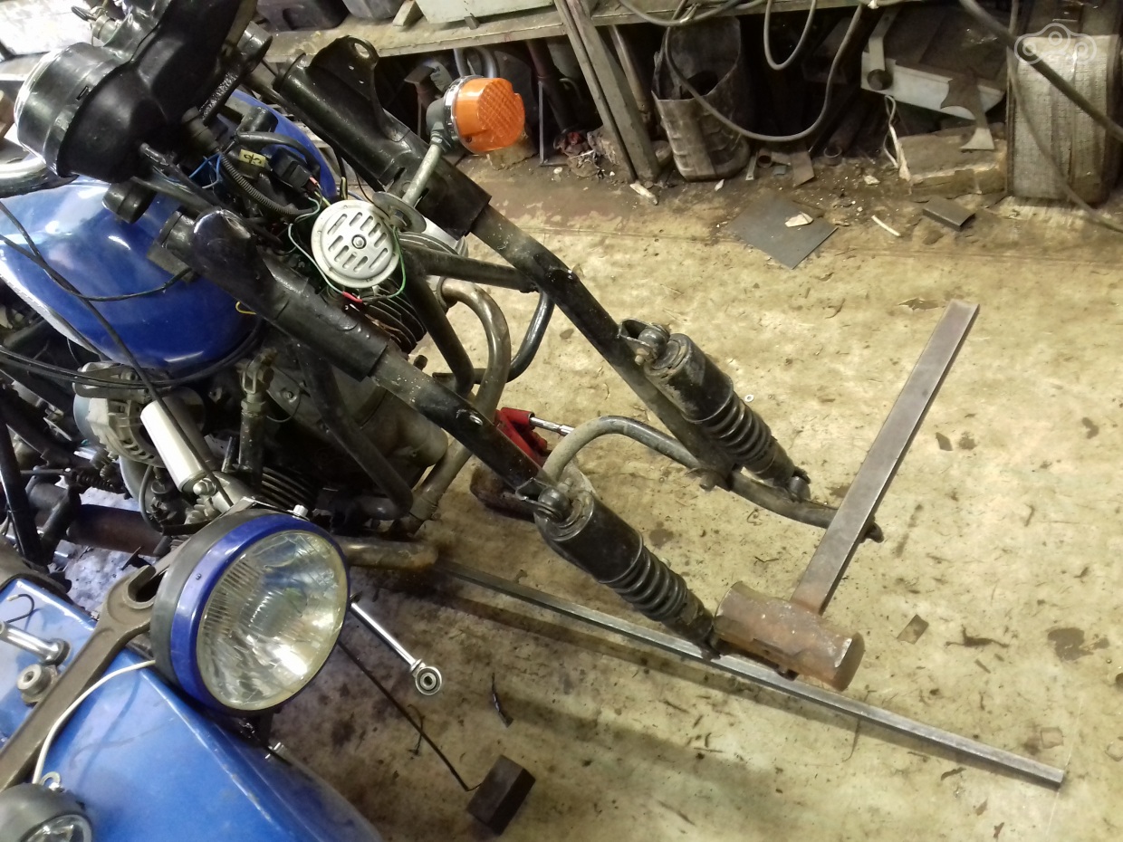 Всё. Развал теперь у нас в нулях (хотя и положен для одиночки в минус два градуса), теперь схождение. Схождение у мотика было конское. При норме разницы в 10-20 мм между осями (схождение на перед) у меня было около 50 мм. Для регулировки схождения нужно отдать растяжки: