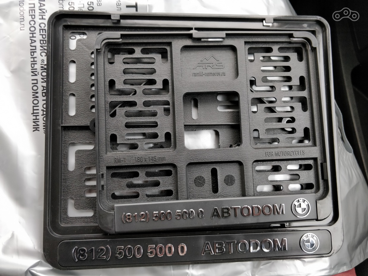 Теперь рамки. Рылся в сети в поисках рамки под номер достаточно долго и ничего мне не понравилось. Значит, ставим, без затей, дилерскую, "и вся любовь..." Итак, однажды, с оказией, занесло меня на стартовую 10(Спб), в отделе запчастей говорю что хочу купить рамки под номер, большую и маленькую. Товарищ, исчезнув за дверью склада на полминуты, вручает мне две новых рамки в красивом пакете, и на вопрос "сколько?" отвечает "бесплатно". Представляете моё удивление?... Дело в том, что я всегда снимал со своих машин дилерские рамки и выкидывал их, не хотел бесплатно возить их рекламу. Теперь ситуация... я согласен бесплатно рекламировать, перед поезкой к дилеру, по телефону интересуюсь ценой рамки, и мне обьявляют 100р за штуку.