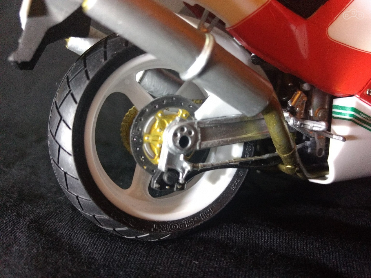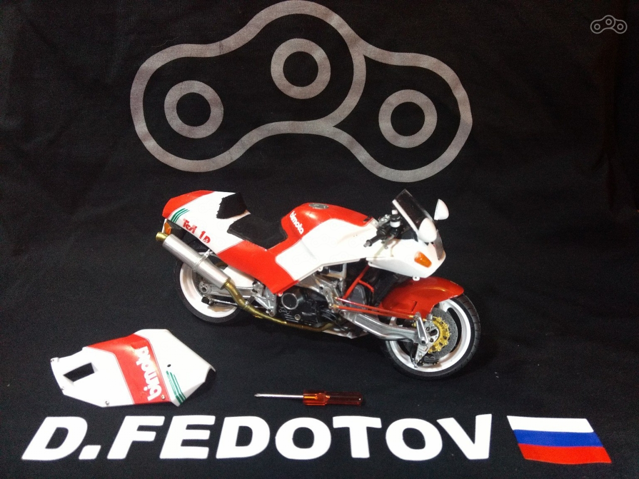 С оперением так же ничего сложного. Обтекатели состоят из тех же элементов, что и у настоящего мотоцикла и так же крепятся болтами, под которые в комплект входит специальная отвертка. Пластик, как и у оригинального мотоцикла, белый, поэтому красить нужно разве что переднее крыло, а вот нанесение декалей потребовало определенной сноровки и специальной жидкости. Именно благодаря ей графика сваривается с пластиком и начинает равномерно облегать обтекатели. Нет сложностей и с чехлом сиденья, благо материал входит в комплект а выкройка прямо в инструкции. В итоге получается вот такая красота: