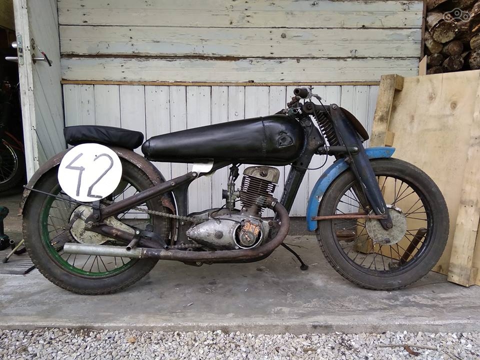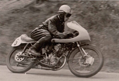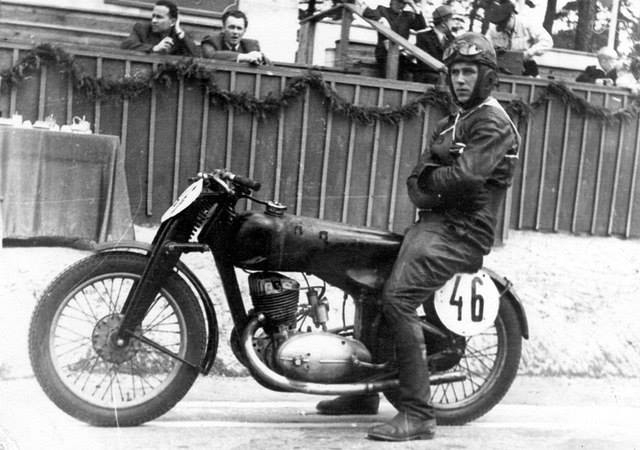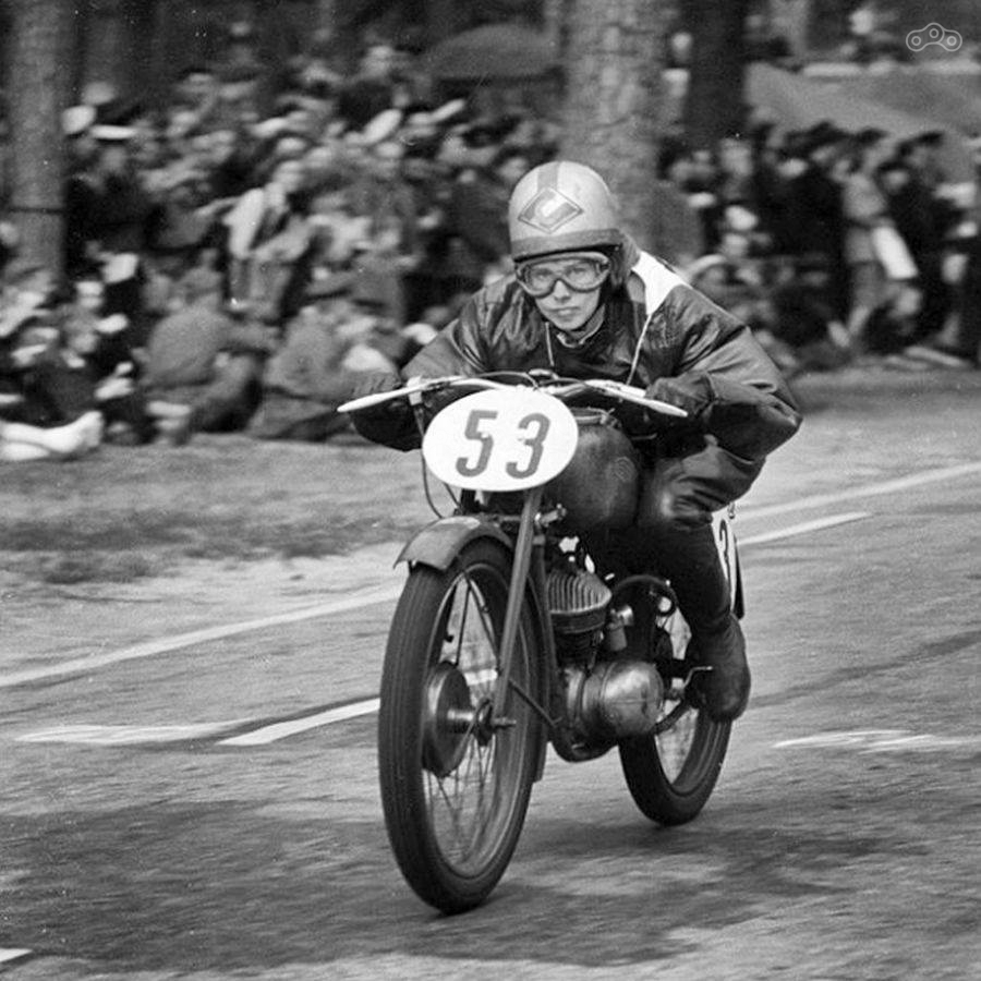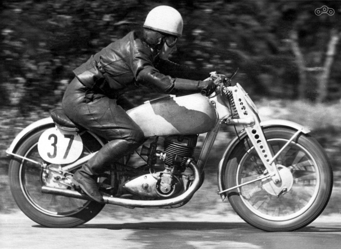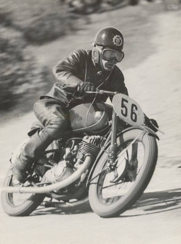 Иж - 350 на трассе, 1953 год, гонщик Helju Küünemäe. Как вам такой способ облегчения передней подвески?