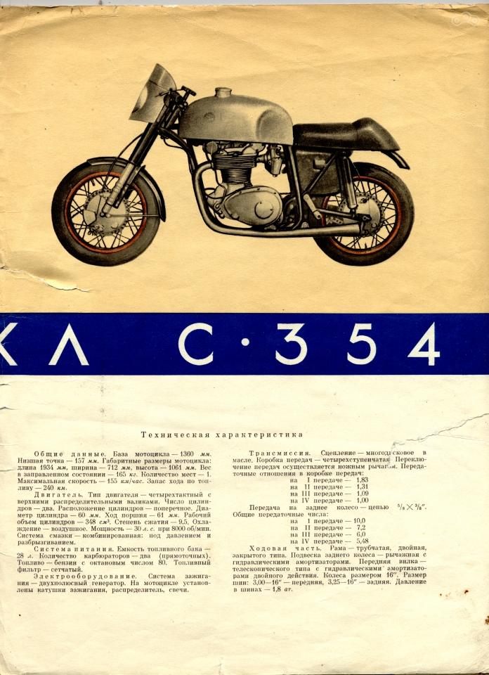 С - 354 нужно отметить как важный этап развития отечественной гоночной техники, так как на основе его ходовой части созданы мотоциклы С - 555, С - 557, С - 358.