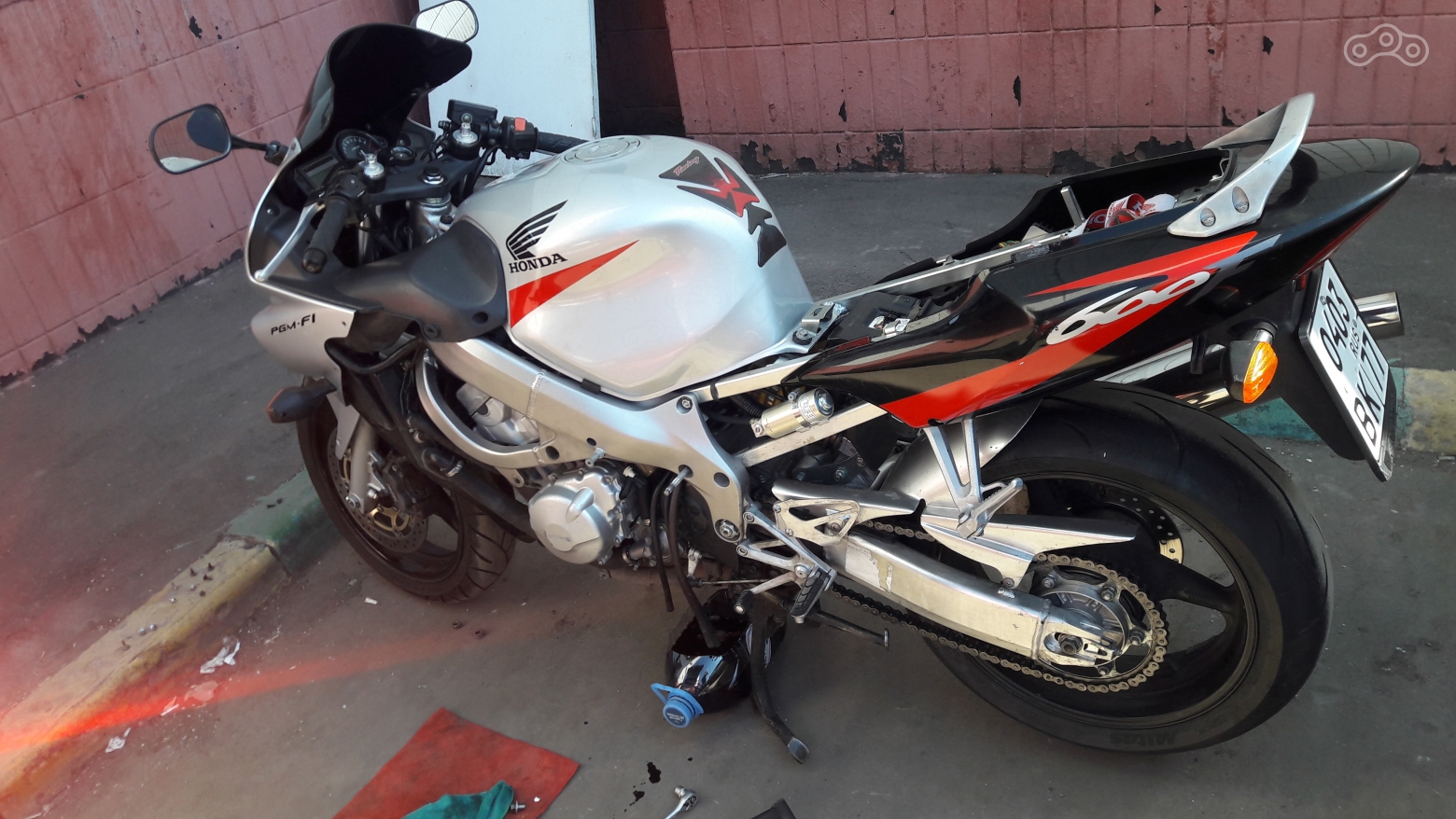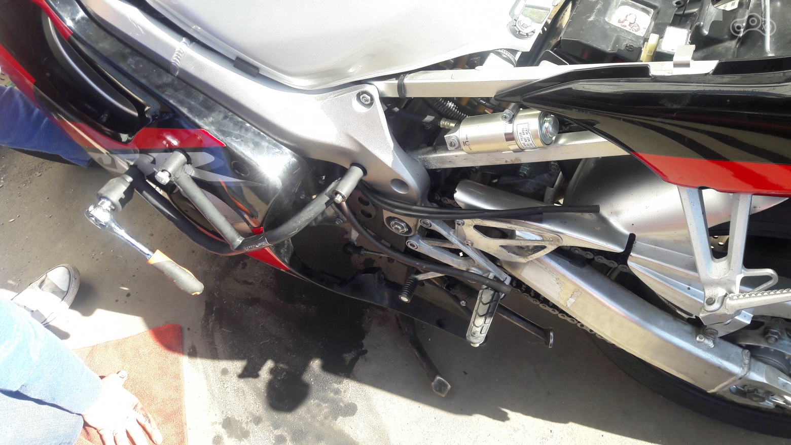 ОХ ЭТИ ДУГИ! Хотелось просто кричать. Я понимаю всю их нужность и безопасность для аппарата, но ё-моЁ!!! Пластик с Хонды снимается ну просто элементарно, но не дуги. Верхнее и нижнее левое крепление, что со слайдером, с обратной стороны рамы накручены гайкой. В верхнем креплении гаечка давно взяла отпуск и не вернулась, поэтому и откручивался всё время от вибраций болт.