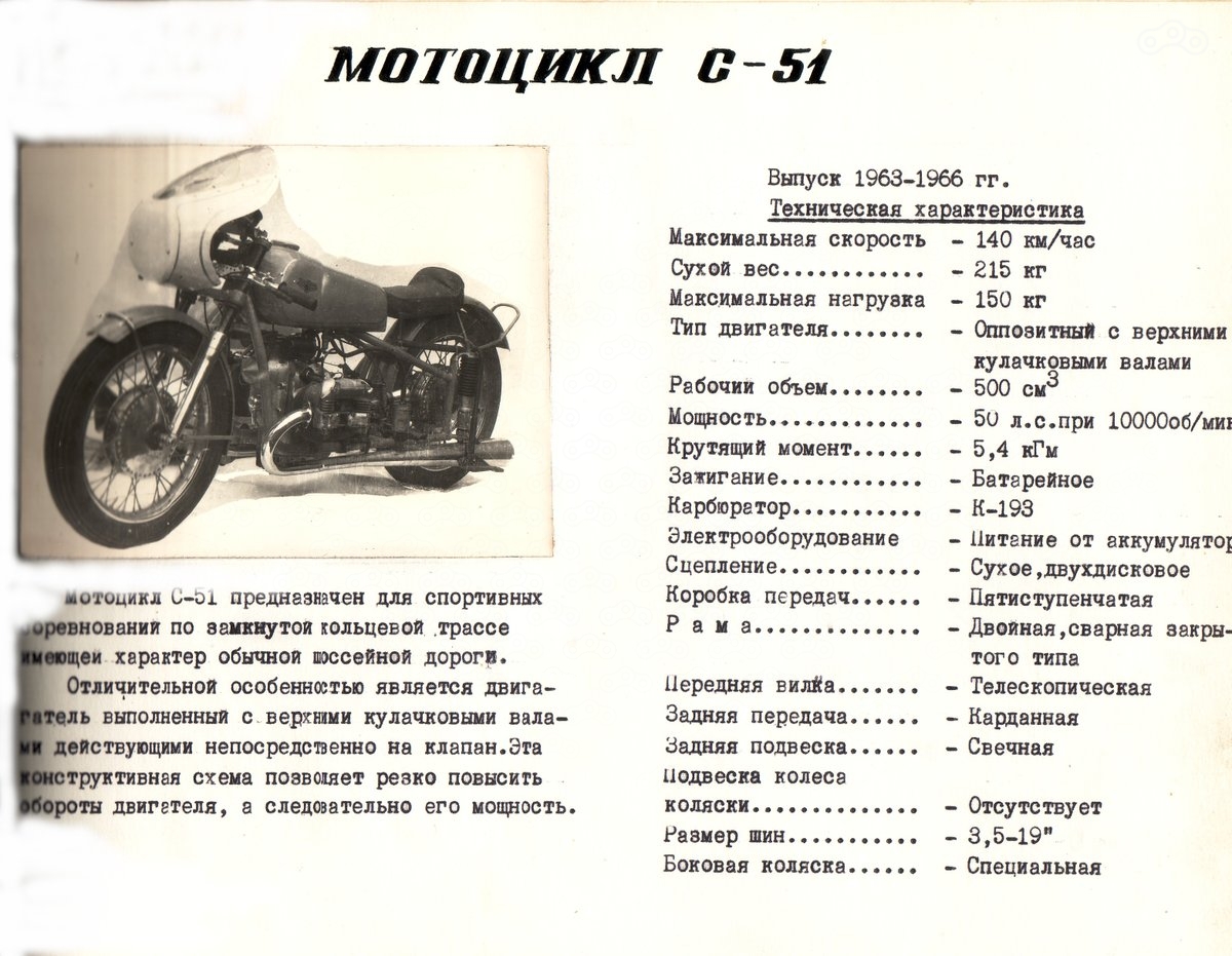 В 1963 году (по другим данным, в 1961) в Серпухове на базе хорошо известного нам М - 52С был создан экспериментальный мотоцикл под индексом С - 51. Все основные характеристики можно видеть на картинке из архива города Ирбита.