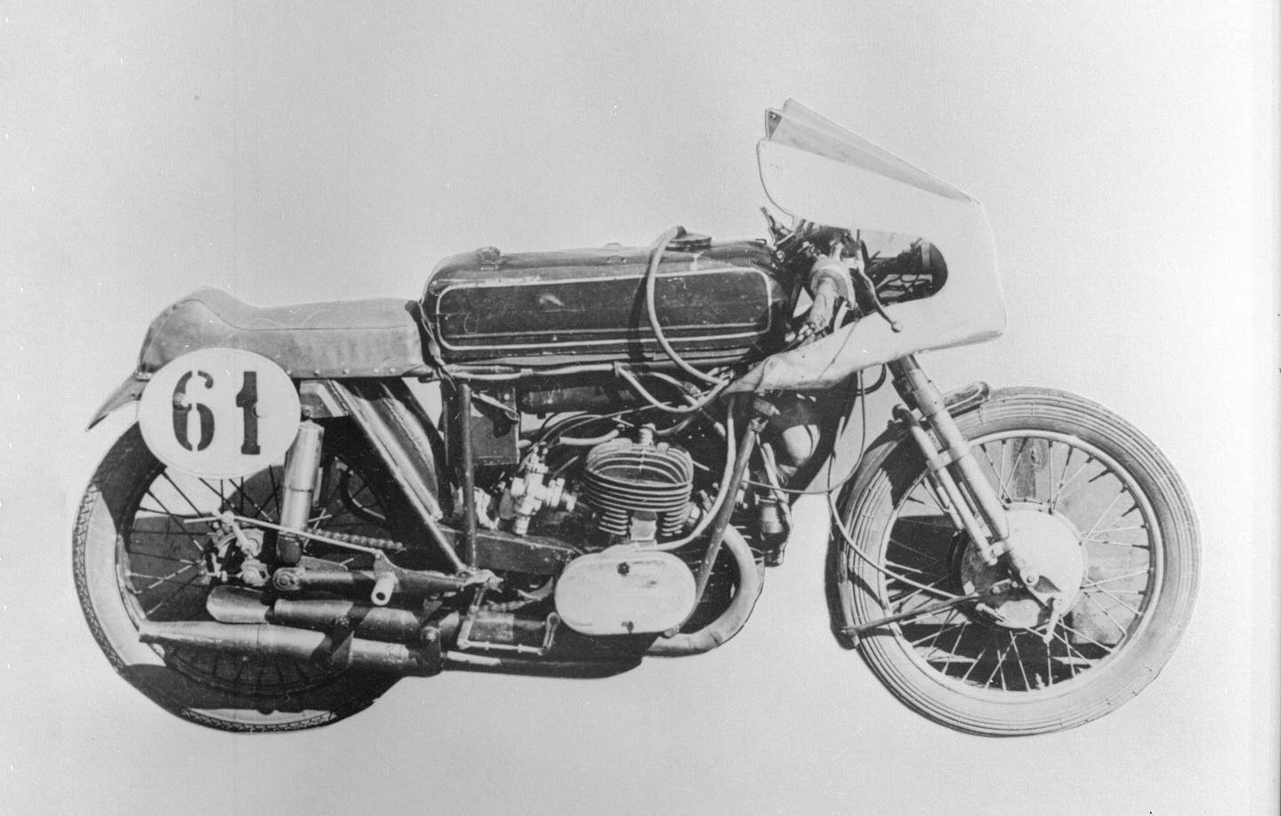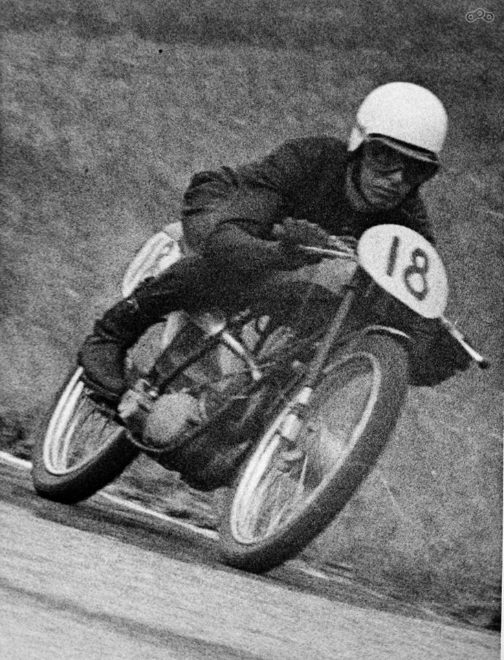 Рижский завод "Саркана звайзгне" представил свой первый гоночный мотоцикл SZ - 50. На снимке заводской гонщик А. Ахранович.