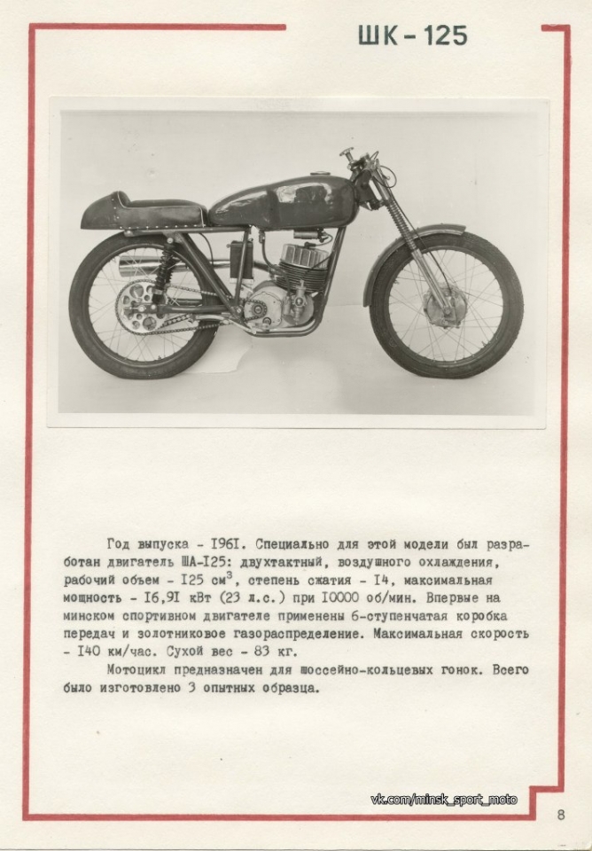 В 1961 году был создан ШК - 125, мотоцикл с кардинально новым двигателем, золотниковым впуском, шестиступенчатой коробкой передач и очень высокой литровой мощностью -125 куб.см, 23 л.с. при 10000 об.мин. Это тогда было на уровне лучших гоночных мотоциклов мира.