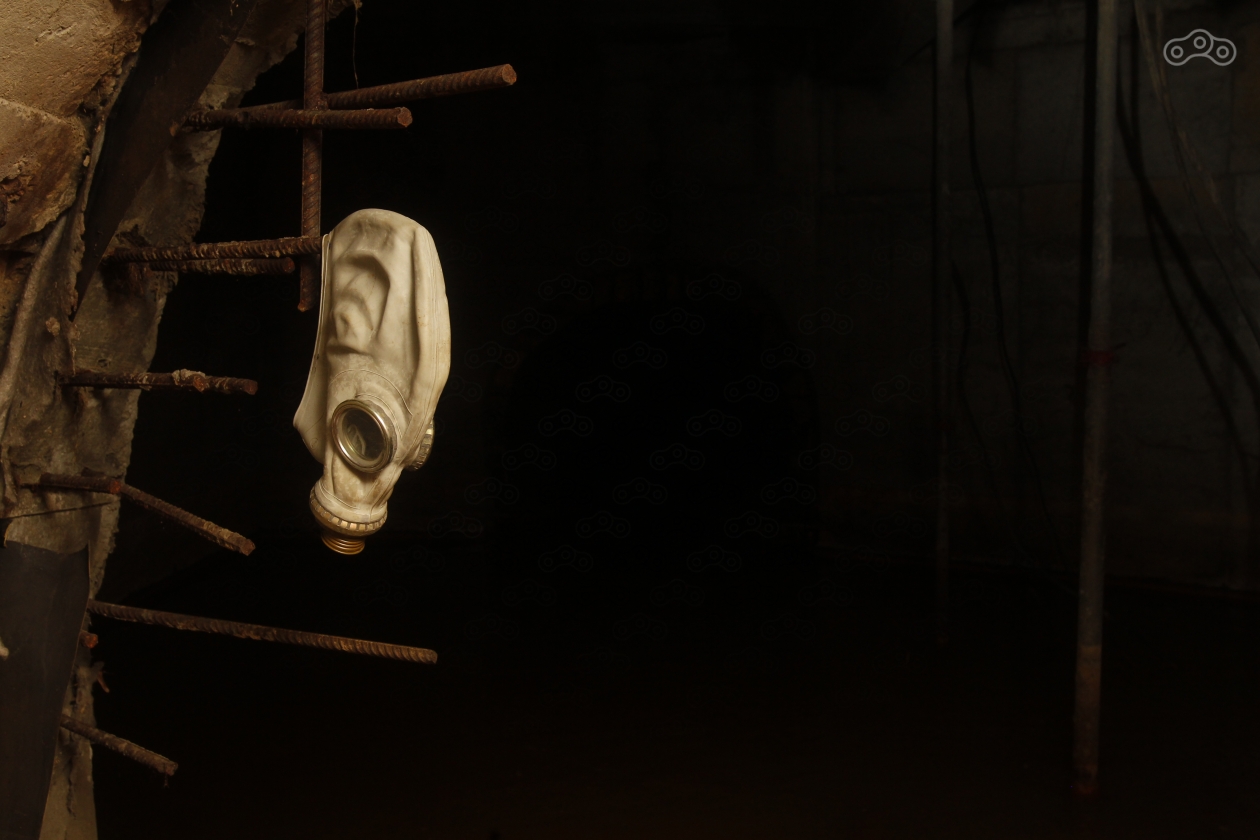 Сделав несколько общих фотографий мы с Ваней уступили аппараты Зелибобе и Мише, а сами пошли пешком с диггерами под неумолкающее щелканье затвора фотоаппарата Саши. Вскоре показалось ответвление в коллектор советской постройки. Бетонный спуск оказался резким: для пешеходов висела веревка с узлами, ну а парням на питбайках пришлось спускаться вниз ходом, с зажатыми тормозами. Все прошло как по маслу, и вот мы уже идем по широкому квадратному тоннелю из бетонных плит с настоящими тротуарами по краям. Из стен торчат куски арматуры, какие-то лохмотья. Вот — старый противогаз, как призрак прошлого, висит на стене и поглядывает на нас выбитыми стеклами, жутковато насмехаясь над нашей неуклюжестью.