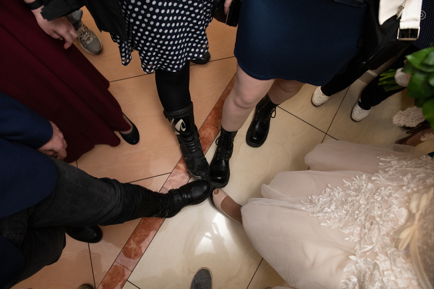 День свадьбы - всегда волнительно. Все красивые, нарядные и местами в экипировке. Да, верхняя часть на официальной части мероприятия снимается, но ботинки остались у всех.