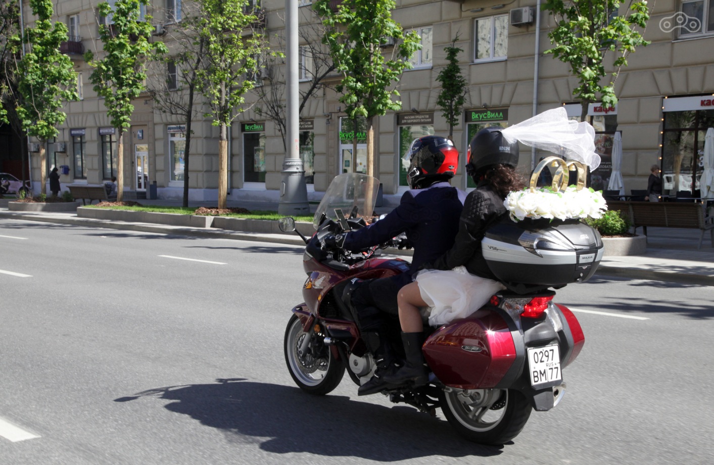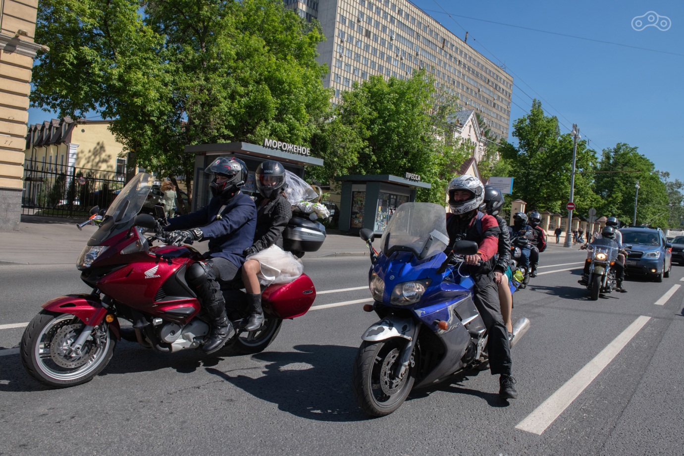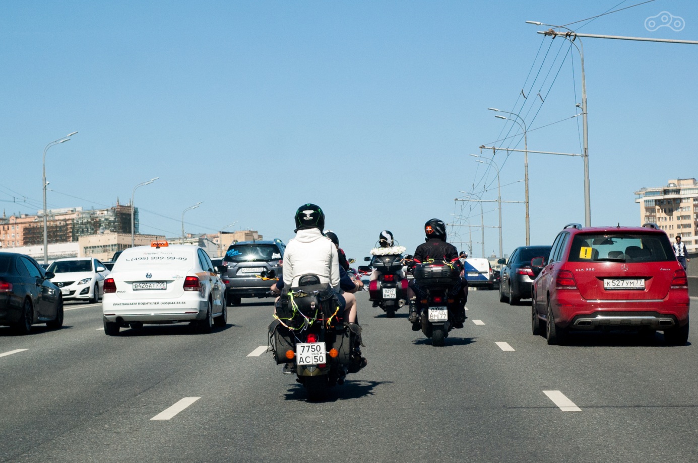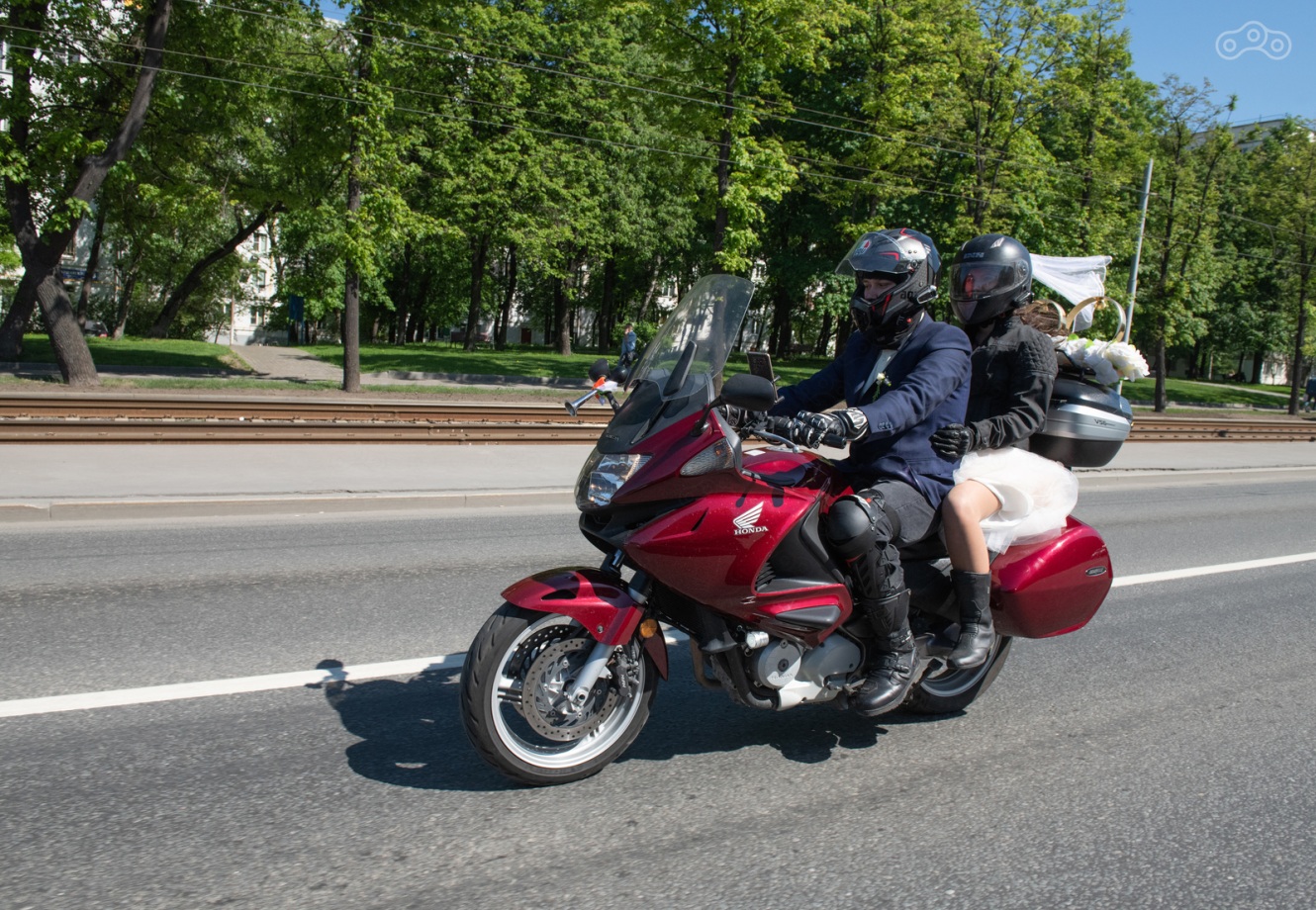 Водитель машины сбоку видит свадебную колонну и выражает одобрение бибиканьем, ну как обычно свадебному кортежу сигналят. Ребята из колонны бибикают в ответ. Народ просыпается, видит свадьбу, мотоциклы, расступается. Ну, раз нас пропускают, проползаем вперёд. Поползли немного, встали. Водитель машины сбоку видит свадебную колонну... Ну вы поняли))