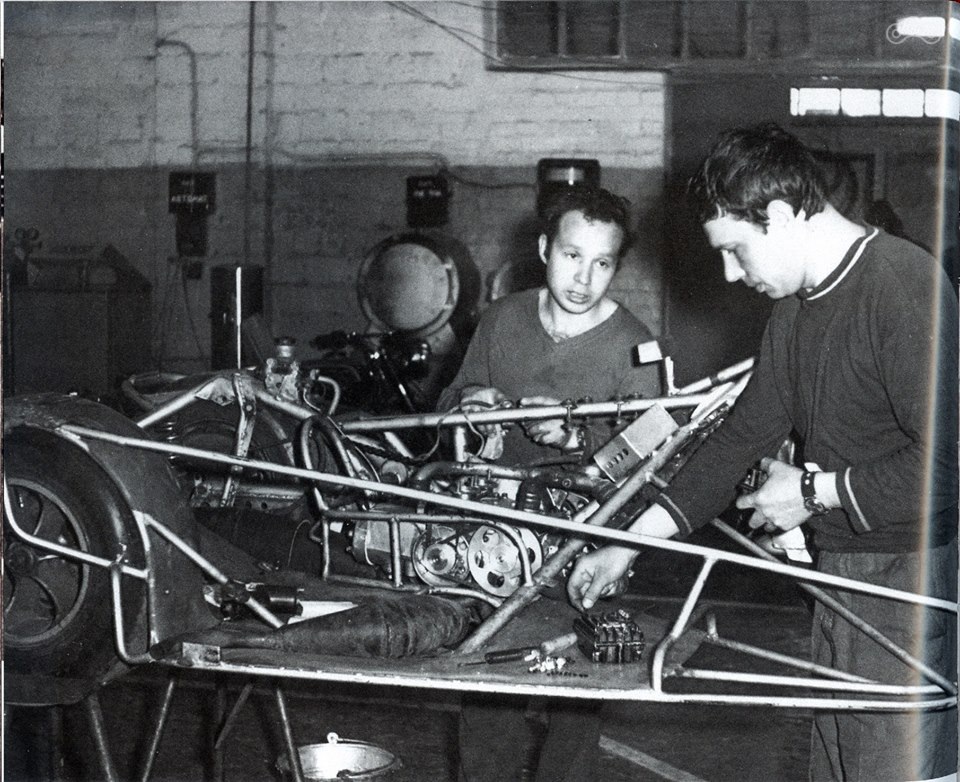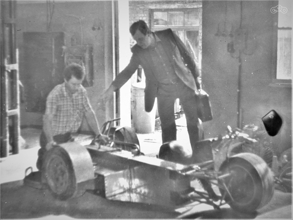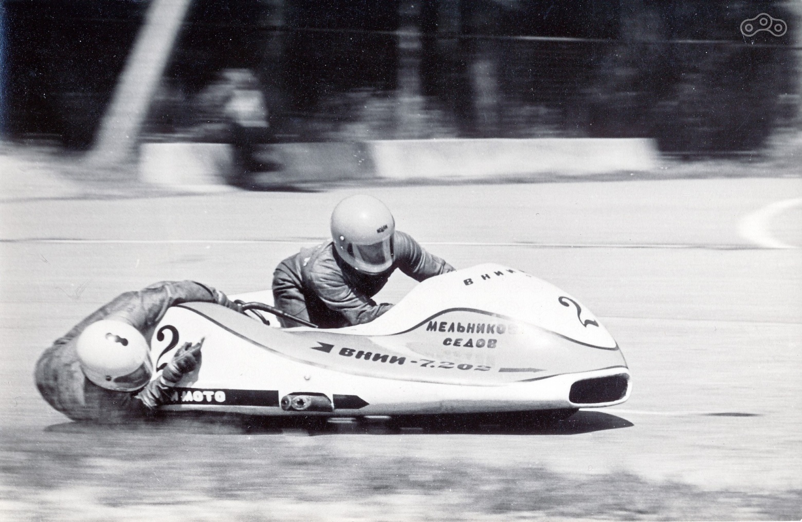 Более поздний вариант гоночного мотоцикла КМЗ, за рулем Александр и Федор Сероповы.