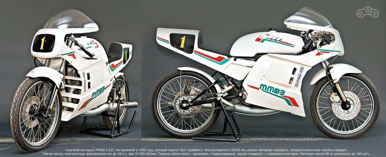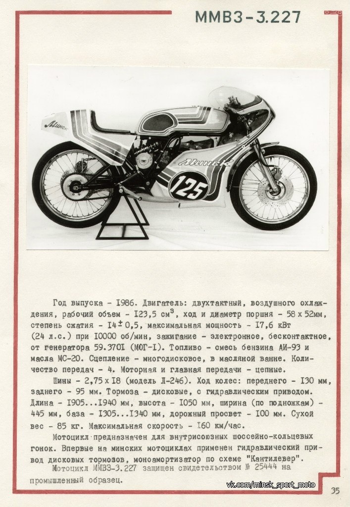 Последний гоночный мотоцикл Минского Мото Вело Завода появился в 1986 году. Новая модель получила индекс 3.227 и выпускалась до 1991 года. За это время было выпущено около двухсот штук и конечно, до наших дней их сохранилось совсем немного.