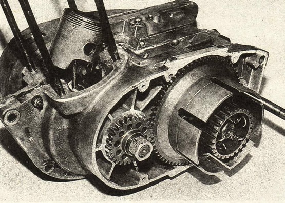 Зубчатая передача в моторе ММВЗ. Картер требует доработок, так как шестерня на корзине большого диаметра для более "короткого" передаточного отношения.