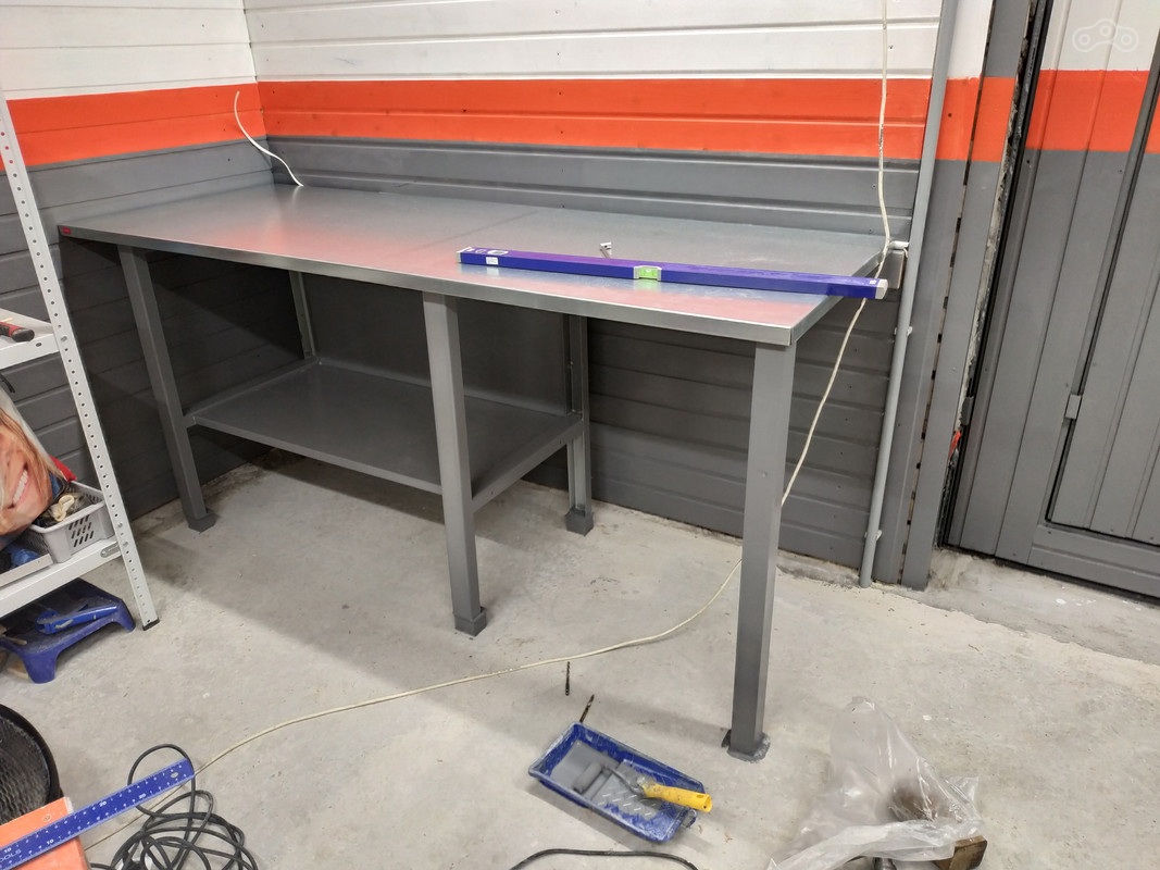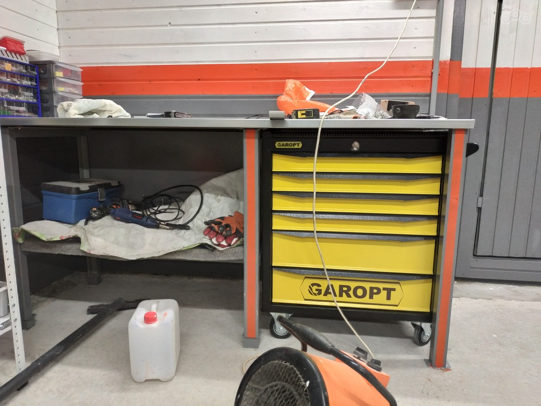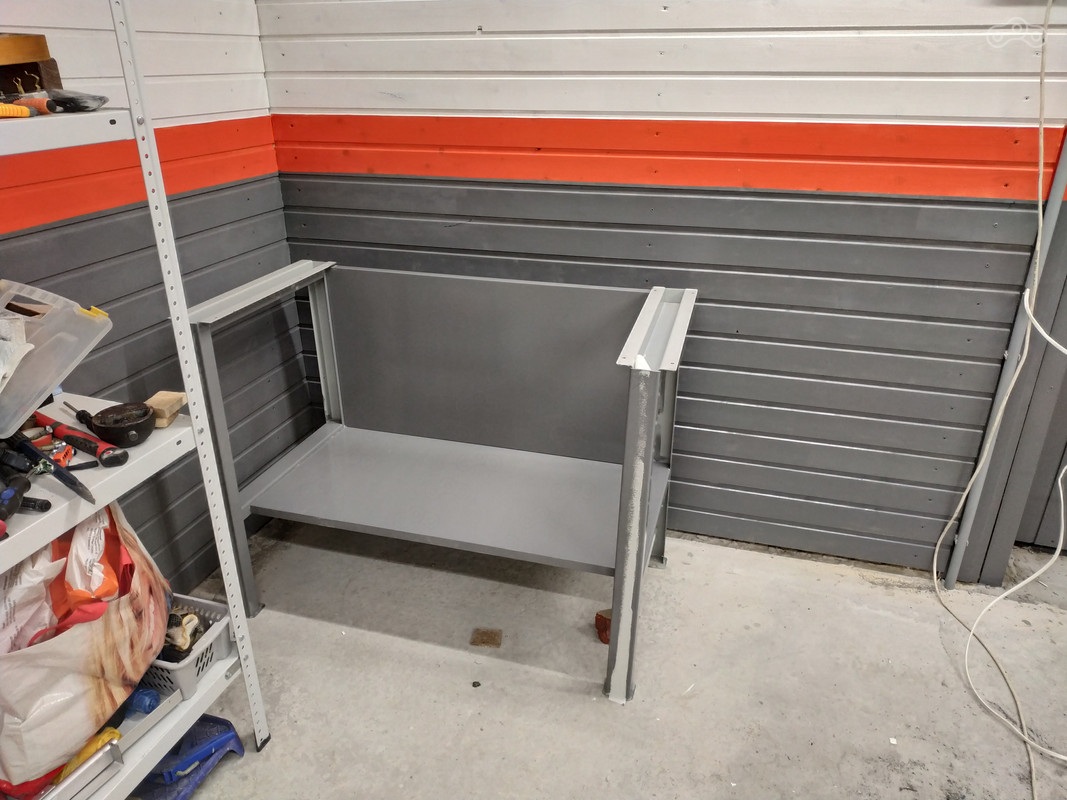 Далее снова вернулся к обустройству рабочего места, а то надоели разбросанные везде инструменты. Верстаку снесло его короткую крышу в прямом смысле слова (ну и заодно покрасил его в цвет стены):
