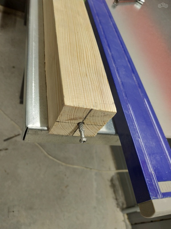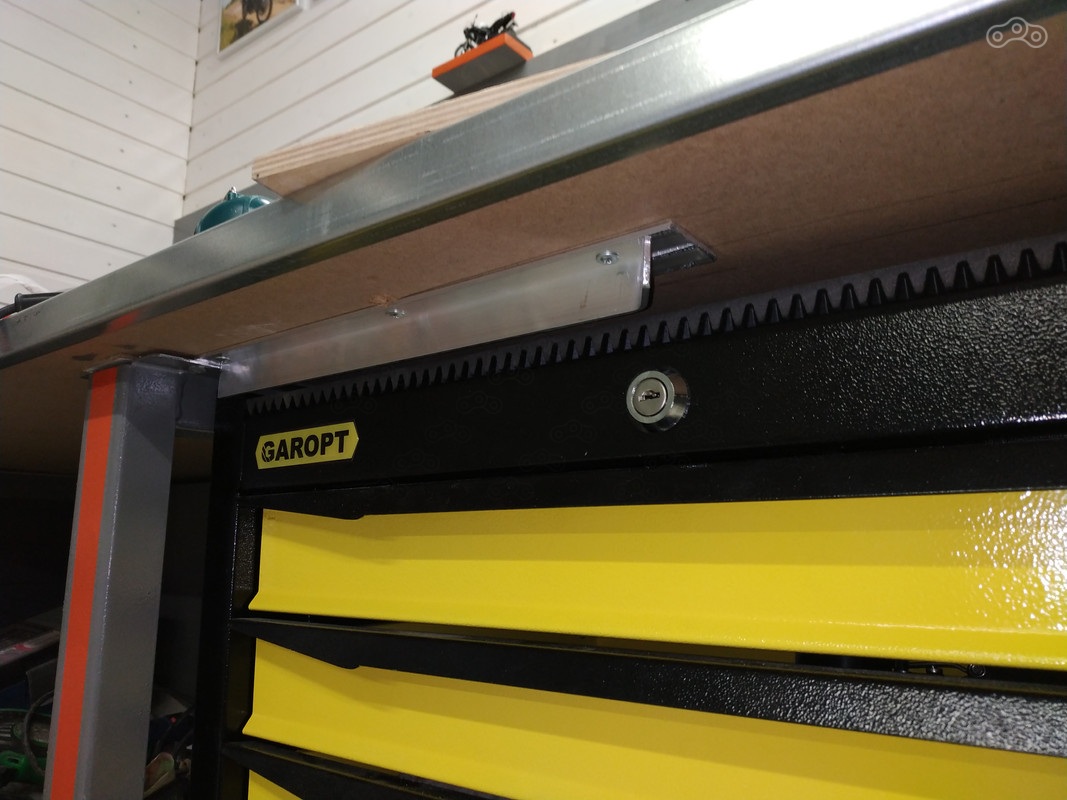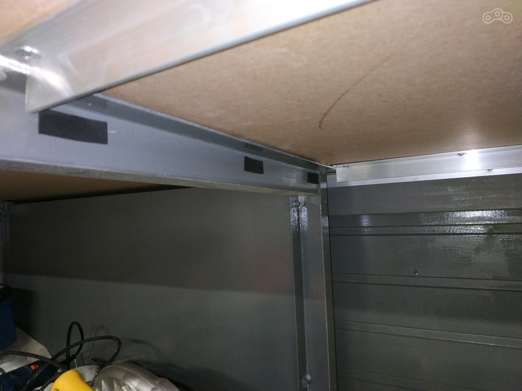 Финальным штрихом облагораживания посадочного места под тележку стала установка алюминиевого уголка на самодельную ножку верстака. Чтобы при неловких заездах или открытиях ящиков не царапать ногу верстака.