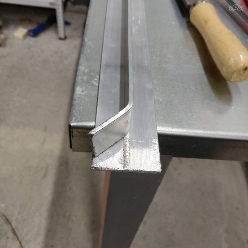 Чтобы тележка въезжала точно под стол и не перекашивалась, пришлось сделать ей алюминиевые направляющие из Т-образного уголка. Немного подпилил, подогнул, просверлил и внедрил на рабочее место: