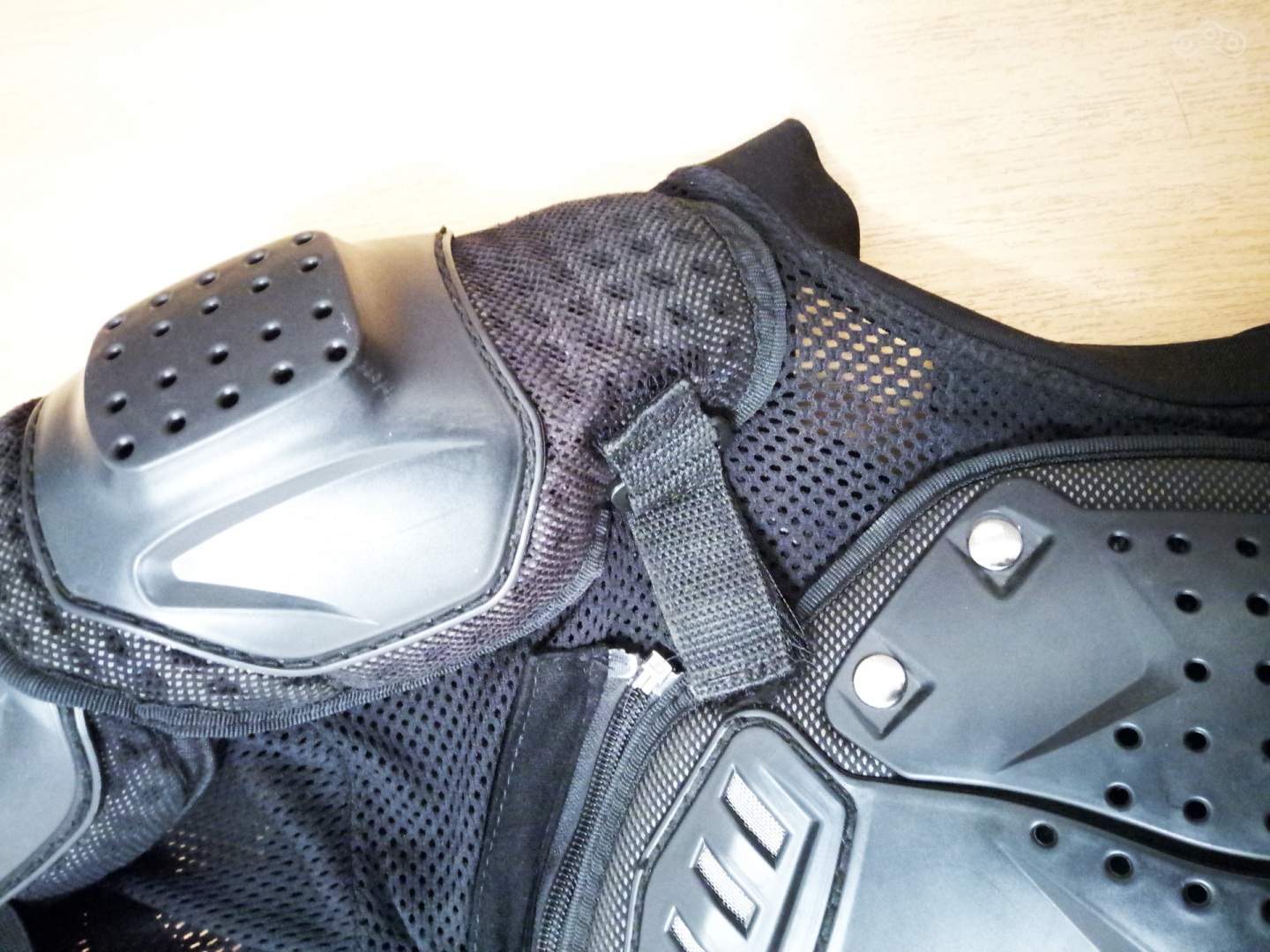 Кратенько пробежимся по составляющим: Имеется защита спины, груди, локтей и плечей. Имеются некие мягкие вставки на уровне пояса непонятного состава и назначения. Элементы из плотного, в меру гибкого пластика за все время не закостенели и даже находятся на своих местах. Отдельно хочу отметить спину, все сегменты защиты проклепаны и прошиты, поясничный отдел держится на шарнире, что очень даже повышает удобство при перемещении. Основа черепахи из сетчатого материала, он слегка тянется, но при этом не прилипает к коже и вполне себе приятен на ощупь.