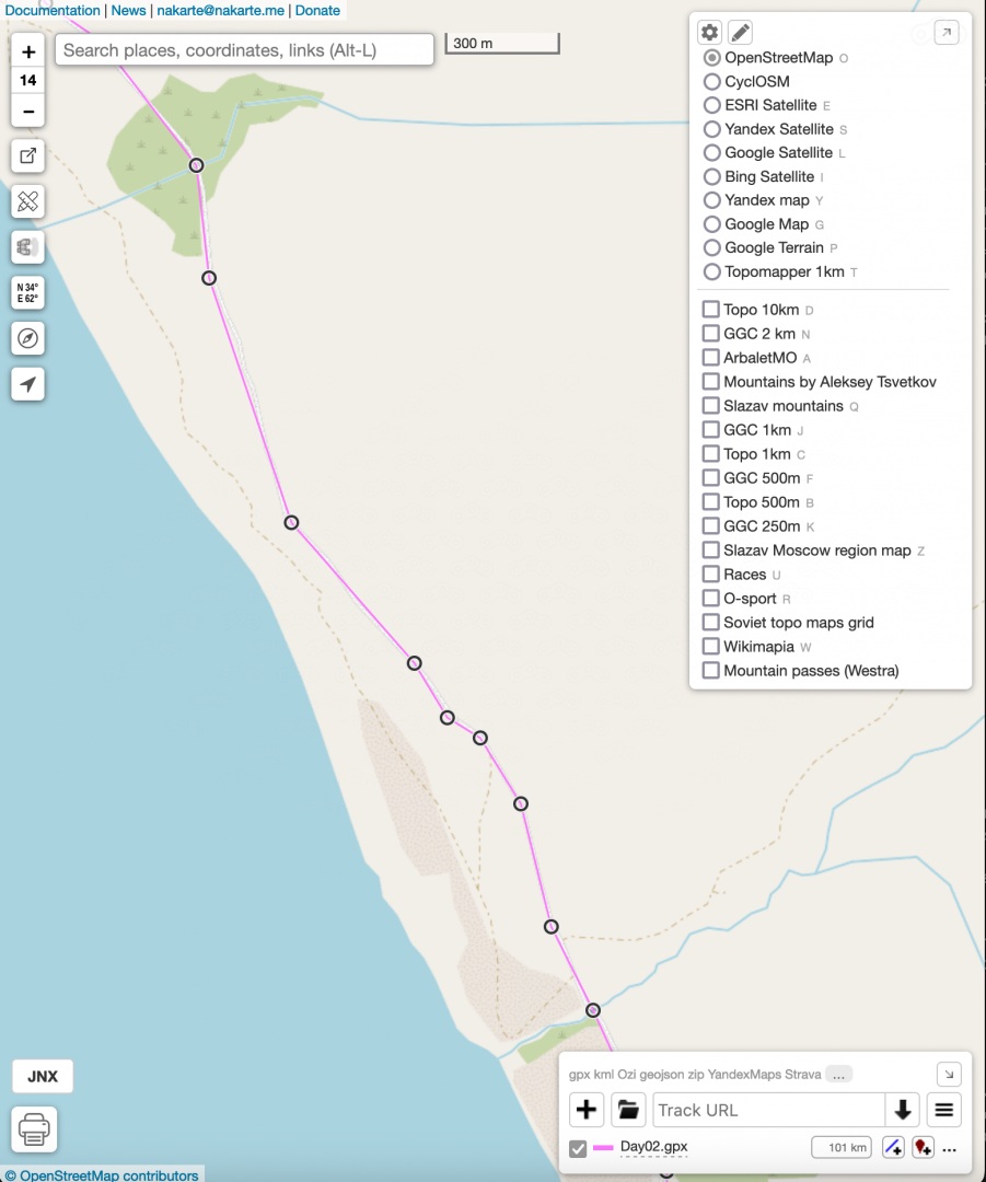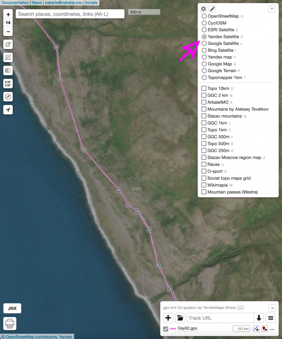 Шаг 3. Затем поочерёдно включаю спутниковые карты Yandex, Google или топографические и проверяю весь трек. Сравниваю с OSM, отмечаю сложные участки — броды, подъёмы, спуски, заболоченные зоны, пересечения с магистралями.