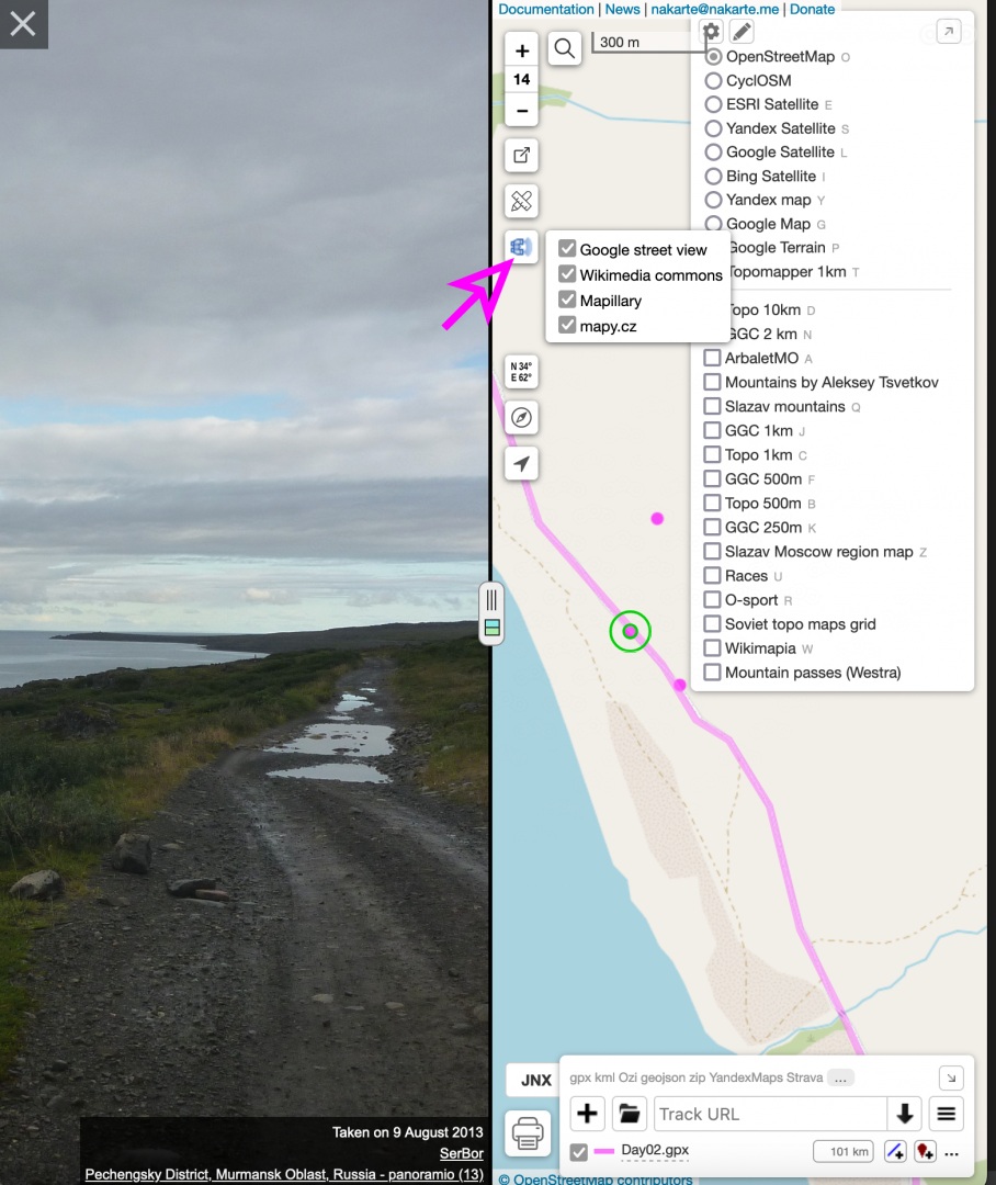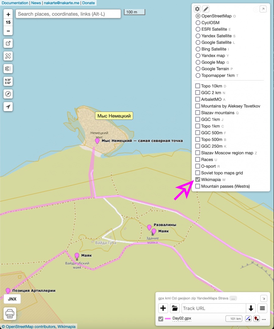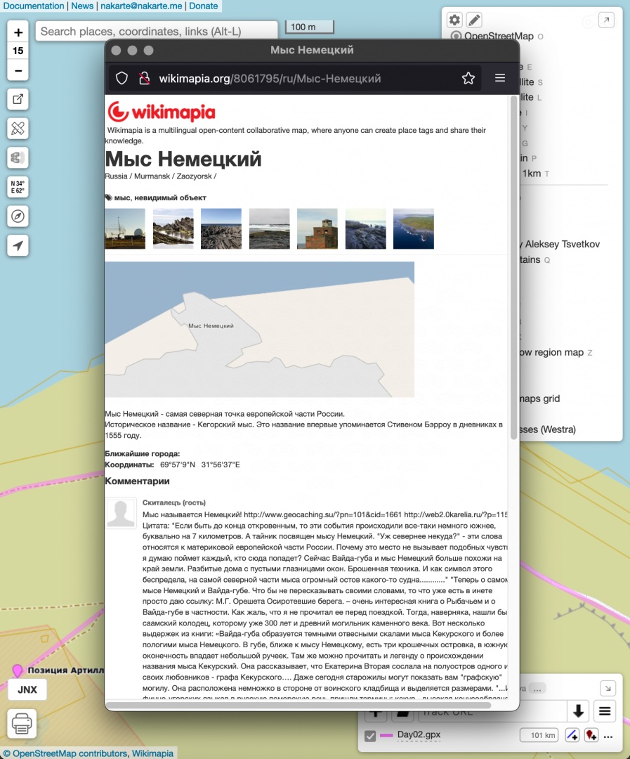 Шаг 4. Включаю слой Wikimapia и прохожу трек ещё раз, читая описания всех локаций.