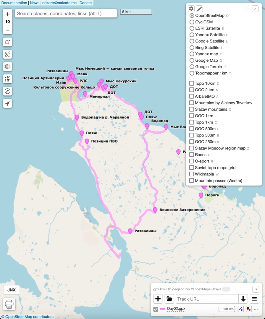 Шаг 1. Открываю онлайн-редактор Nakarte, выбираю слой OSM. Намечаю примерный трек с привязкой к точкам старта и финиша. Проверяю протяжённость — важно, чтобы на мотоцикле хватило топлива, поэтому укладываюсь в 100–120 км. Если трек многодневный, отмечаю АЗС и источники воды. Помню, что после уточнения трек может увеличиться на 20–30%.