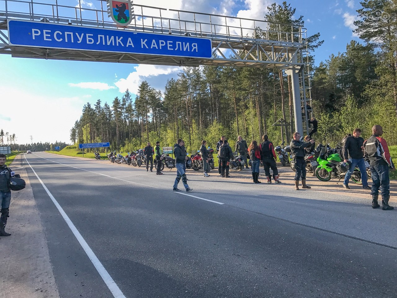 Последней точкой Оранжевого маршрута была граница между Ленинградской областью и Карелией, к которой ведет всем известная грунтовка. По пути к точке, на грунтовке где-то в лесу, нам встретился дедуля на «Днепре» с люлькой. На границе с Карелией мы сделали последнее совместное фото, подымили дымовыми шашками, кто-то даже умудрился забраться на вывеску и растянуть там флаг «Norman’s Riders». В общем, закончился прохват очень эффектно и весело. Всем спасибо за отличный день!»