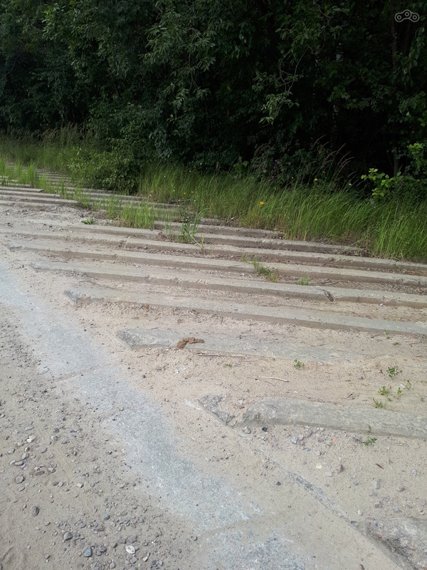 Дорога из плит ведёт прямо в лес. Полное отсутствие машин, пешеходов, кучки мусора и следы неоднократных разворотов говорят что это не проходная тропинка. Вместе с тем - она и не заросла травой. Заброшен объект или нет?