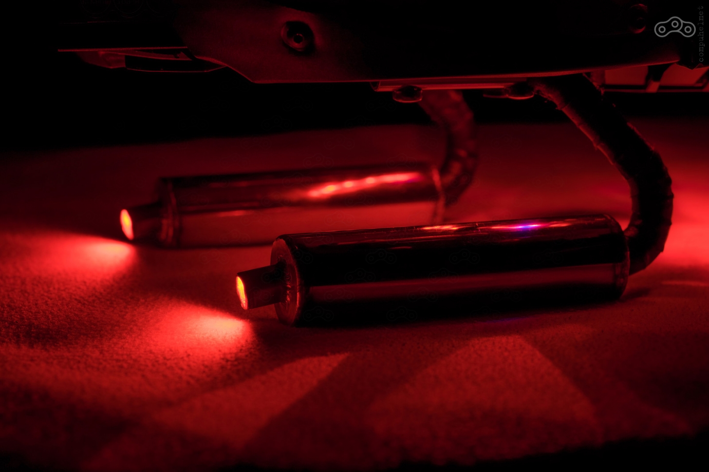 В подставке на концах "глушителей" стоят светодиоды, имитирующие огонь на выхлопе.