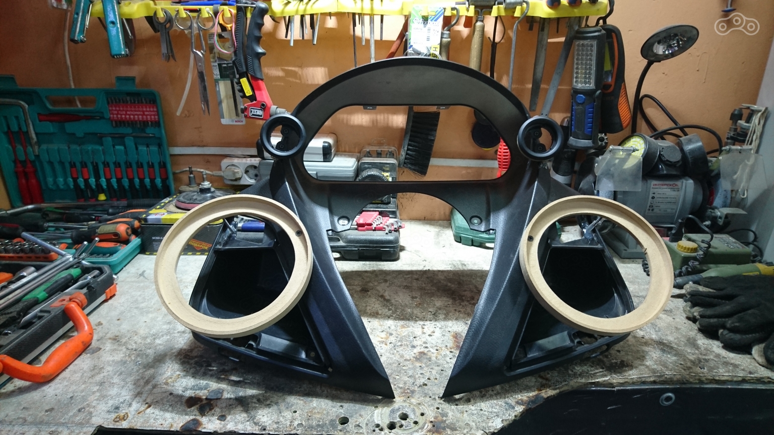 Как я говорил ранее, самое сложное, грязное и кропотливое это изготовление подиумов под динамики. Зачастую приходится переделывать данные компоненты по нескольку раз, то объём не устраивает, то внешний вид, то мешают органам управления. В общем фронтальные получились так,