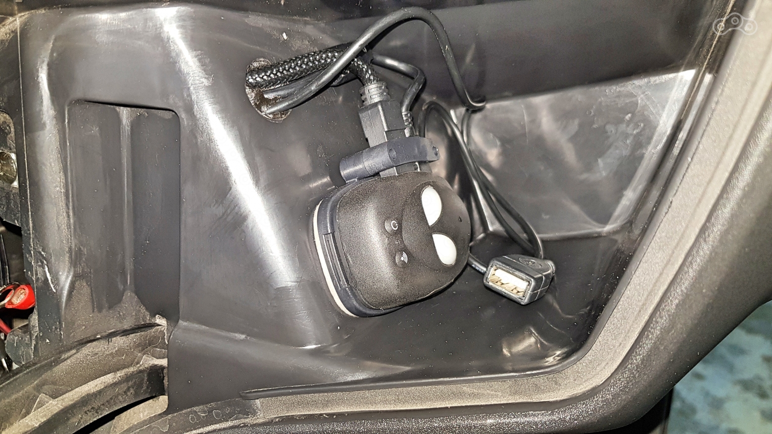 Пульт управления регистратором и USB разъём от магнитолы удобно разместились в бардачке справа под рулём.
