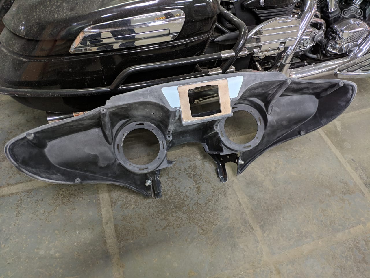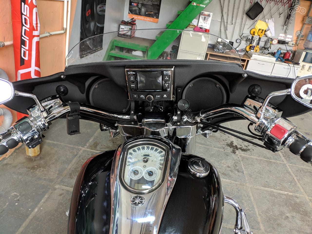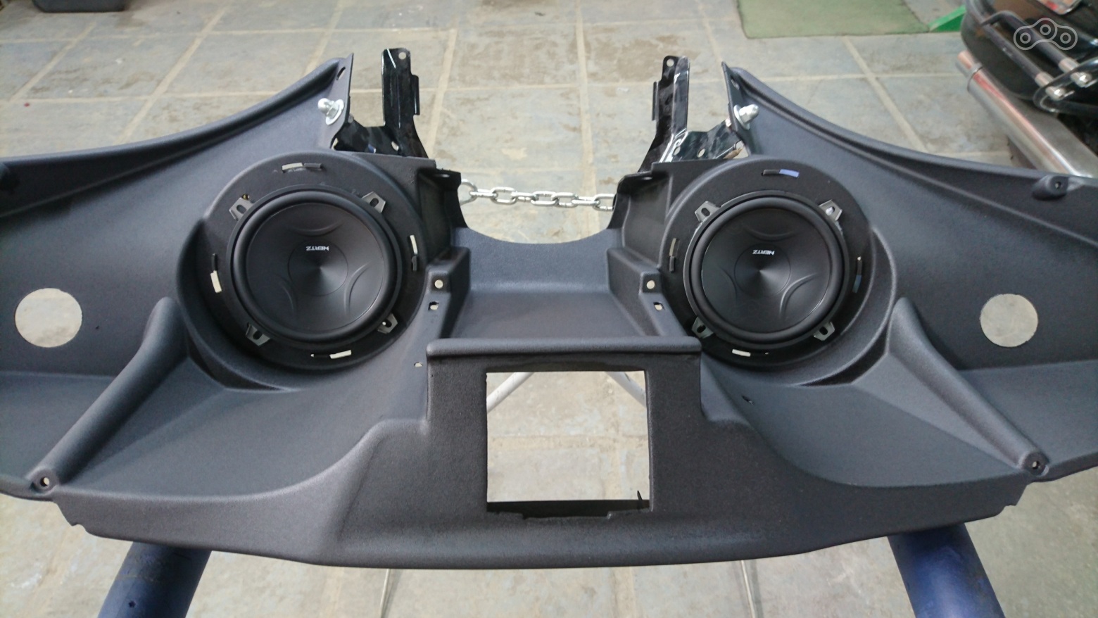 На данном мото нам пришлось внести изменения в лицевую панель бэтвинга, для того чтобы установить головное устройство INFINITY PRV-315.2. Был удалён штатный бардачок и на его месте изготовлен подиум под магнитолу.