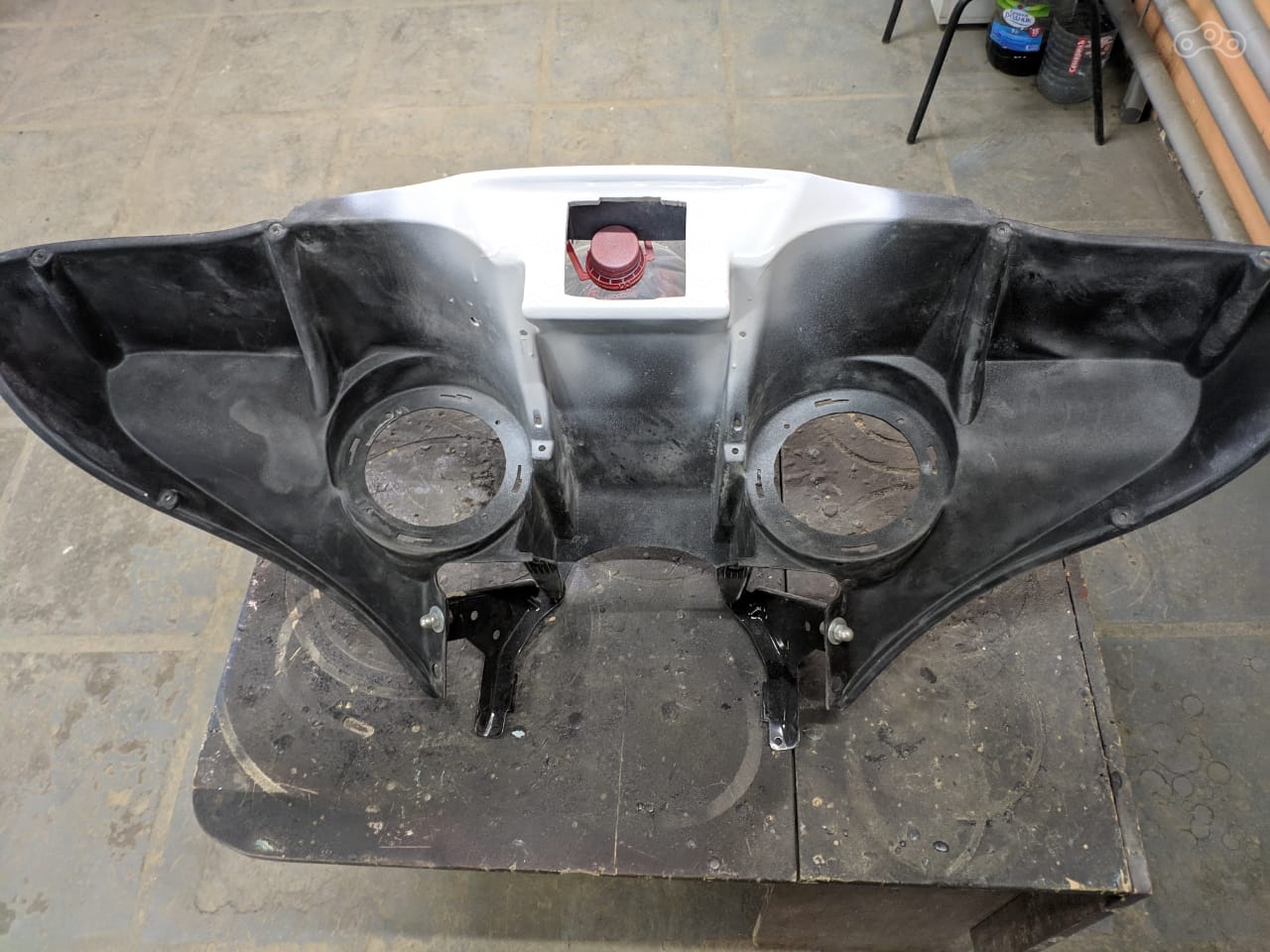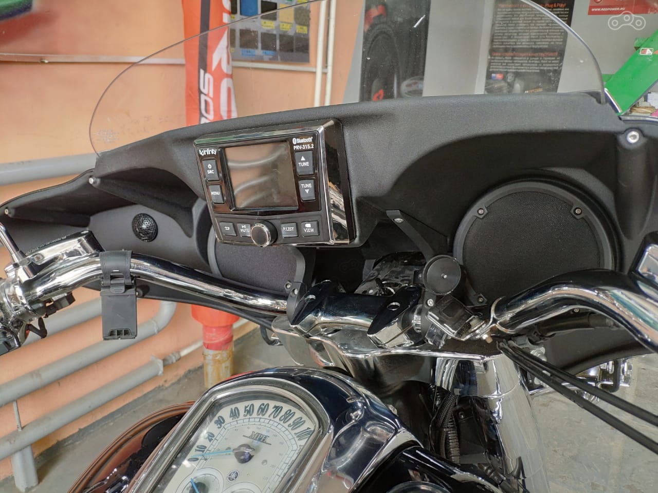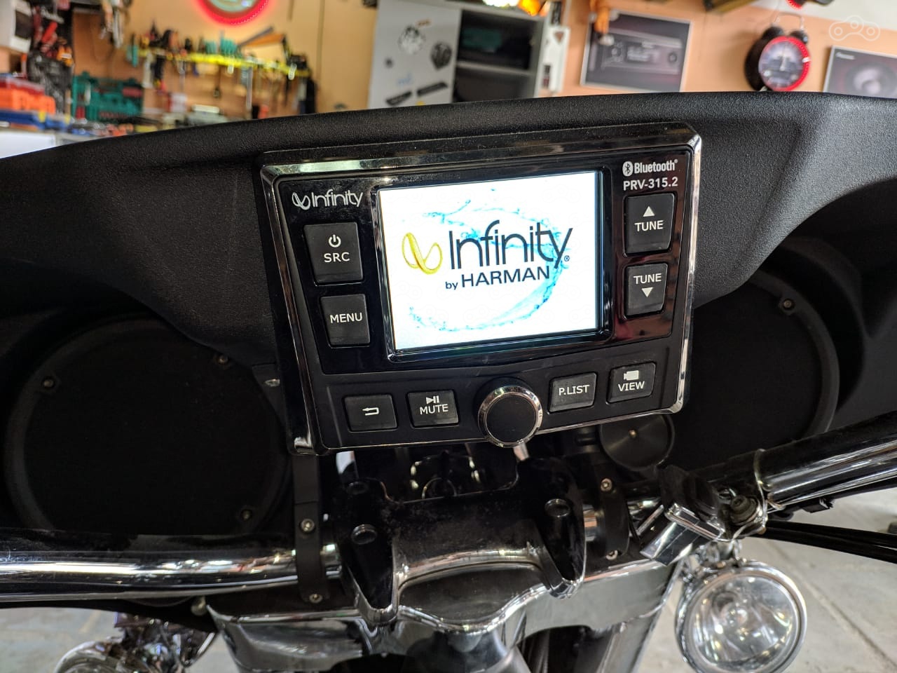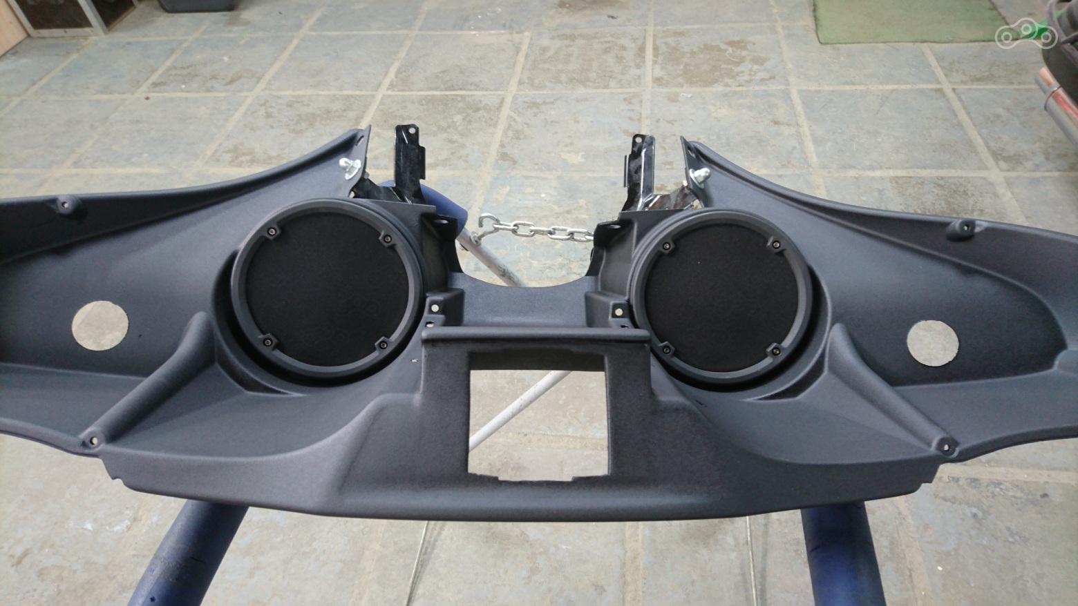 На данном мото нам пришлось внести изменения в лицевую панель бэтвинга, для того чтобы установить головное устройство INFINITY PRV-315.2. Был удалён штатный бардачок и на его месте изготовлен подиум под магнитолу.