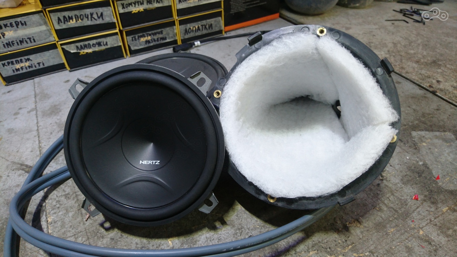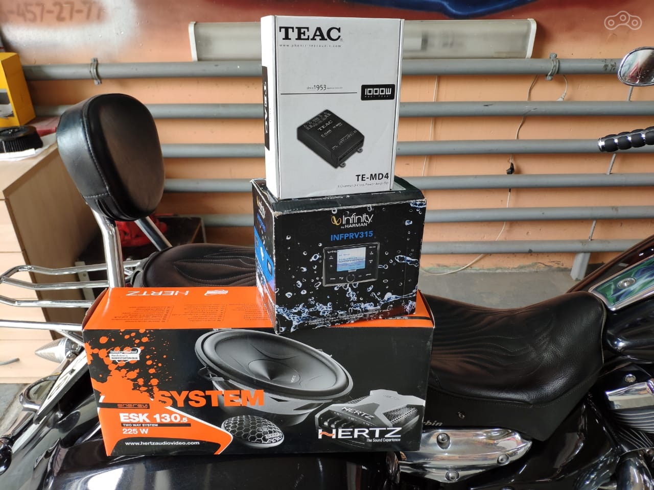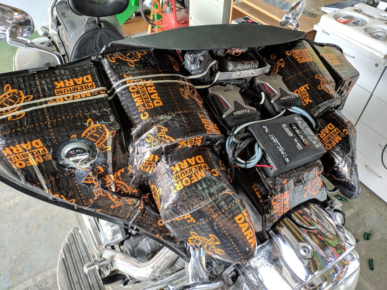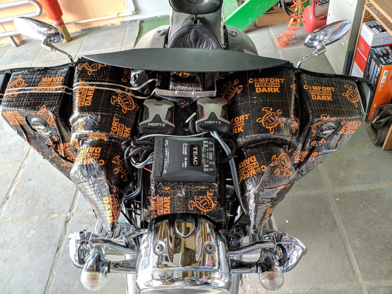 Перейдём теперь к оборудованию, установленному на мотоцикле. Динамики HERTZ установлены в предварительно подготовленные акустические корпуса, а пищалки врезаны в лицевую панель.
